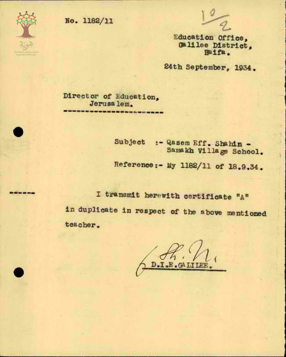 The certificate of Kasim Shahin teacher of Samakh village school