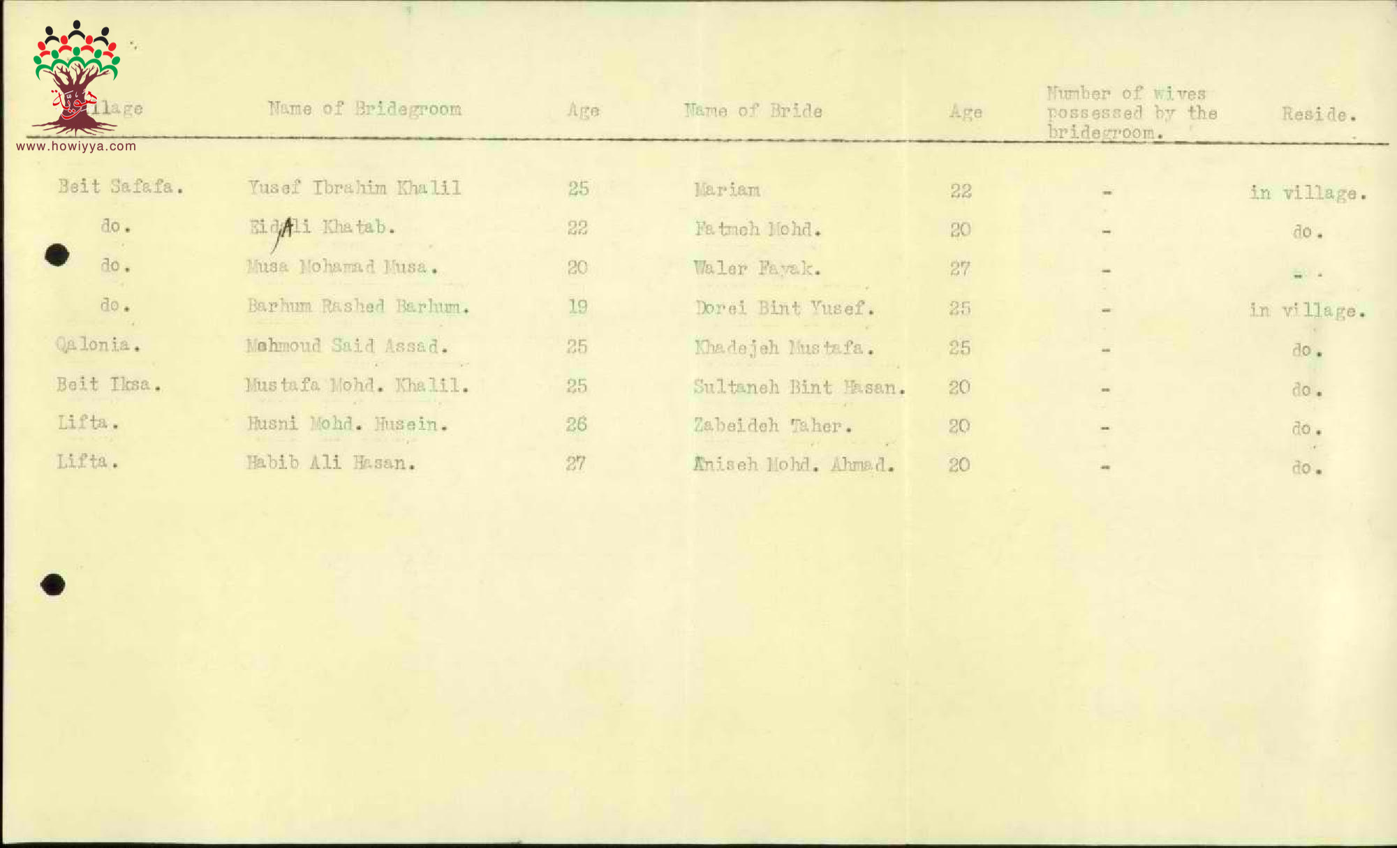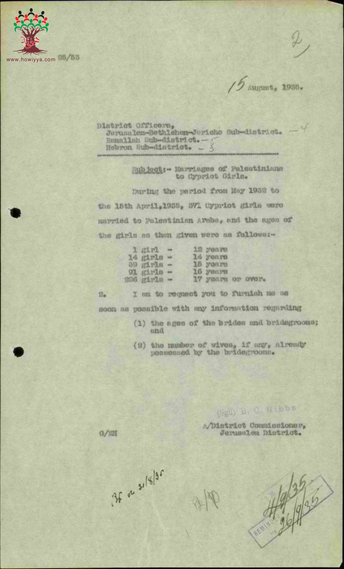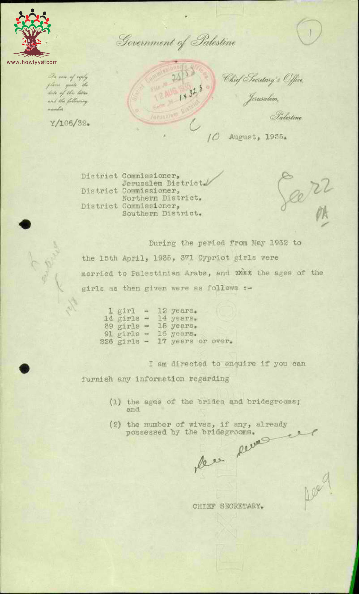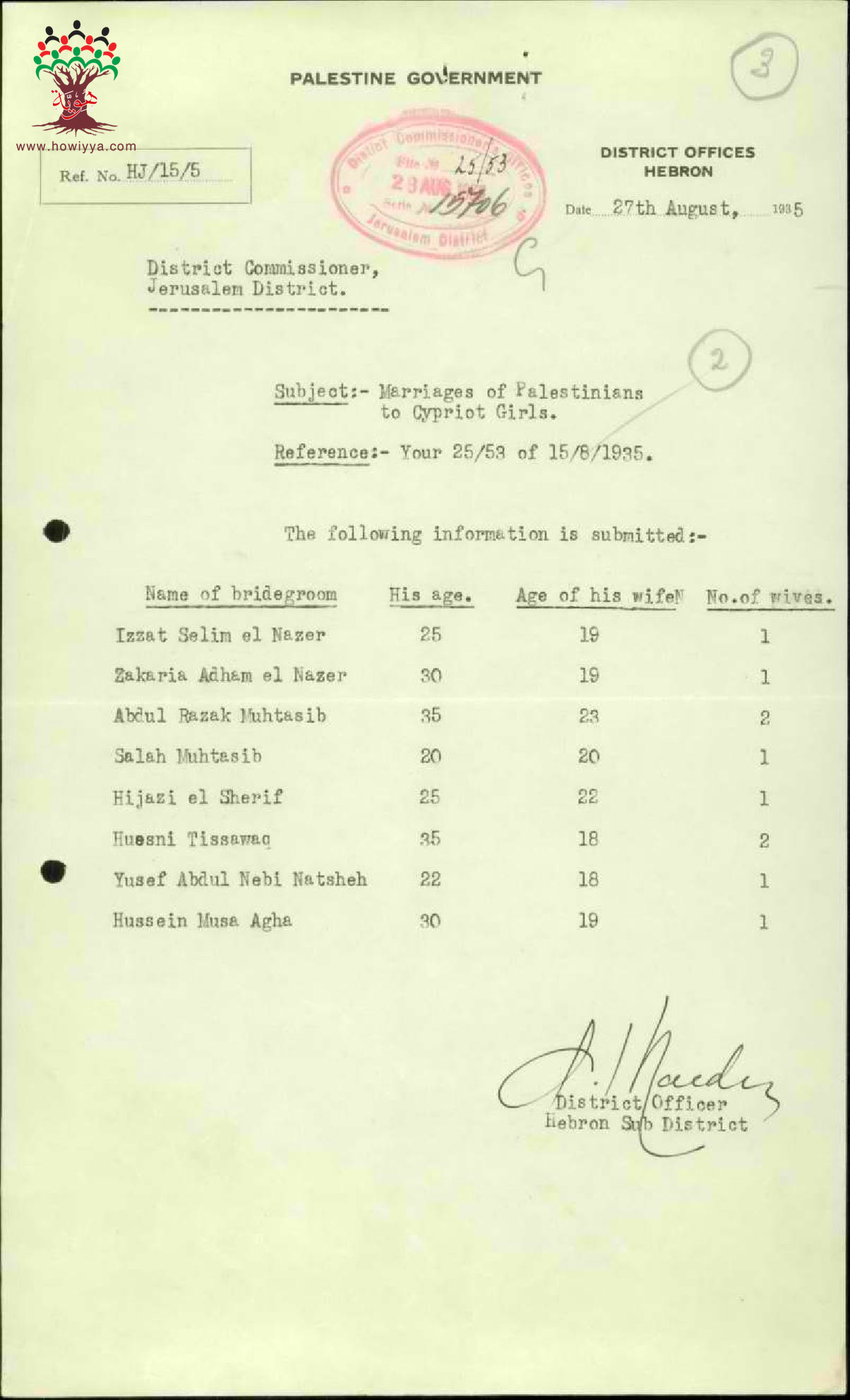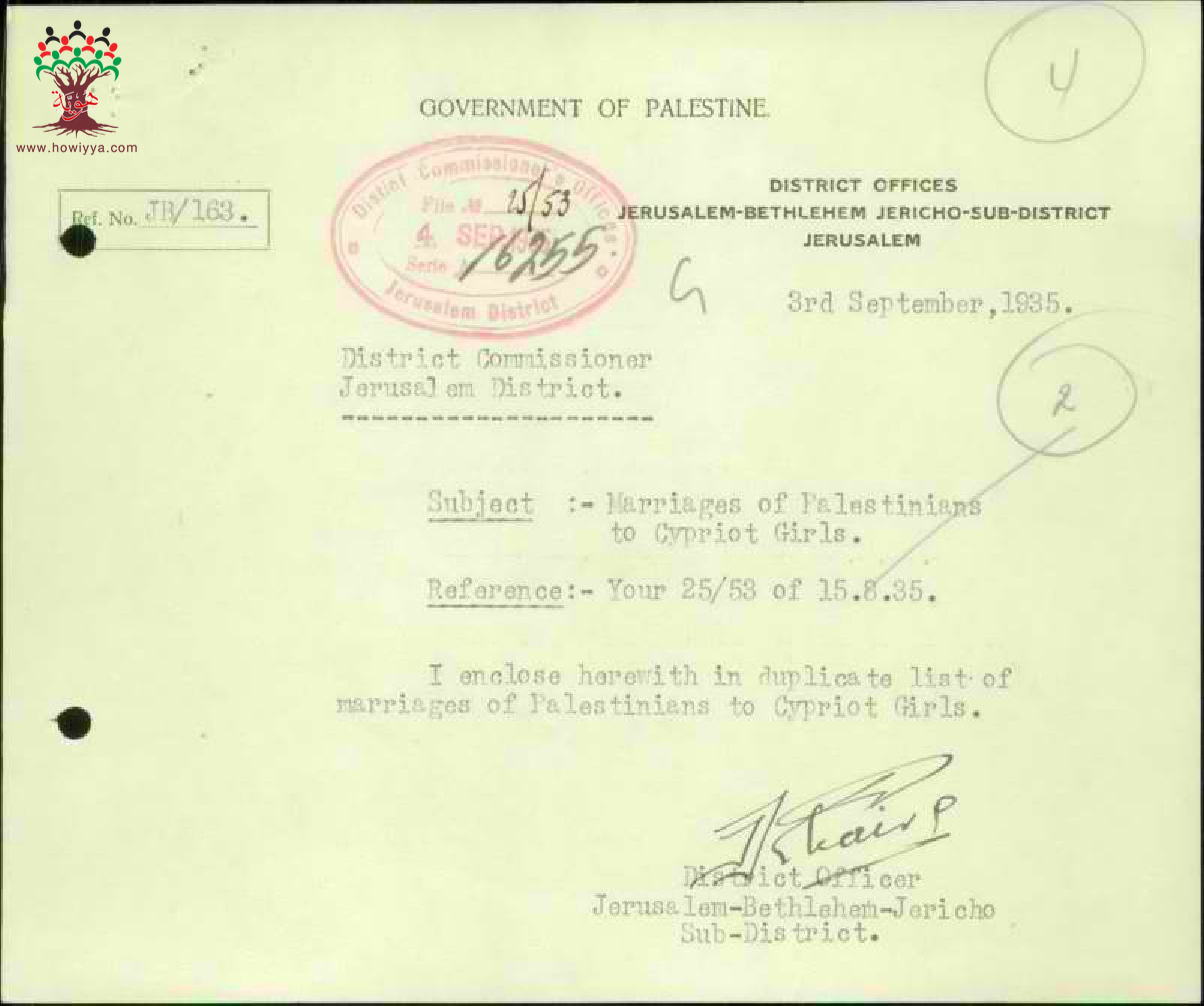 رسالة من ضابط المنطقة في القدس الى حاكم اللواء مرفقة بمجموعة من لوائح أسماء المتزوجين من قبرصيات وأعمارهم