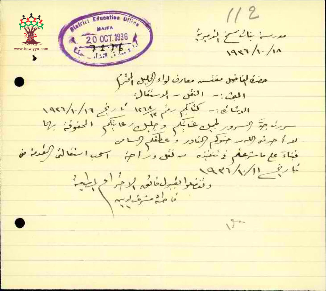 رسالة من المعلمة فاطمة شرف الدين الى مفتش المعارف تسحب فيها استقالتها بعد نقلها