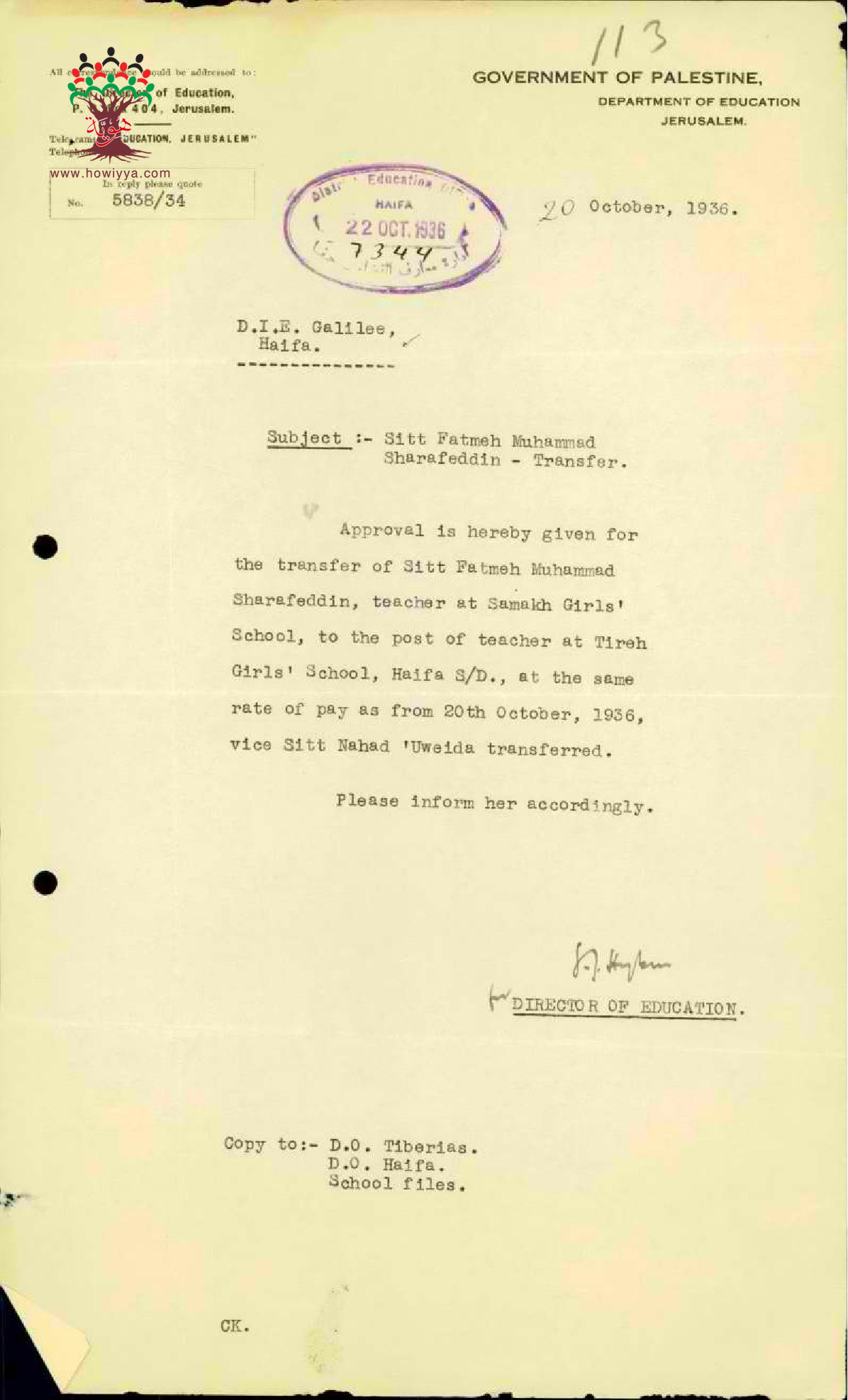 رسائل بخصوص نقل المعلمة فاطمة شرف الدين من مدرسة سمخ الى مدرسة الطيرة