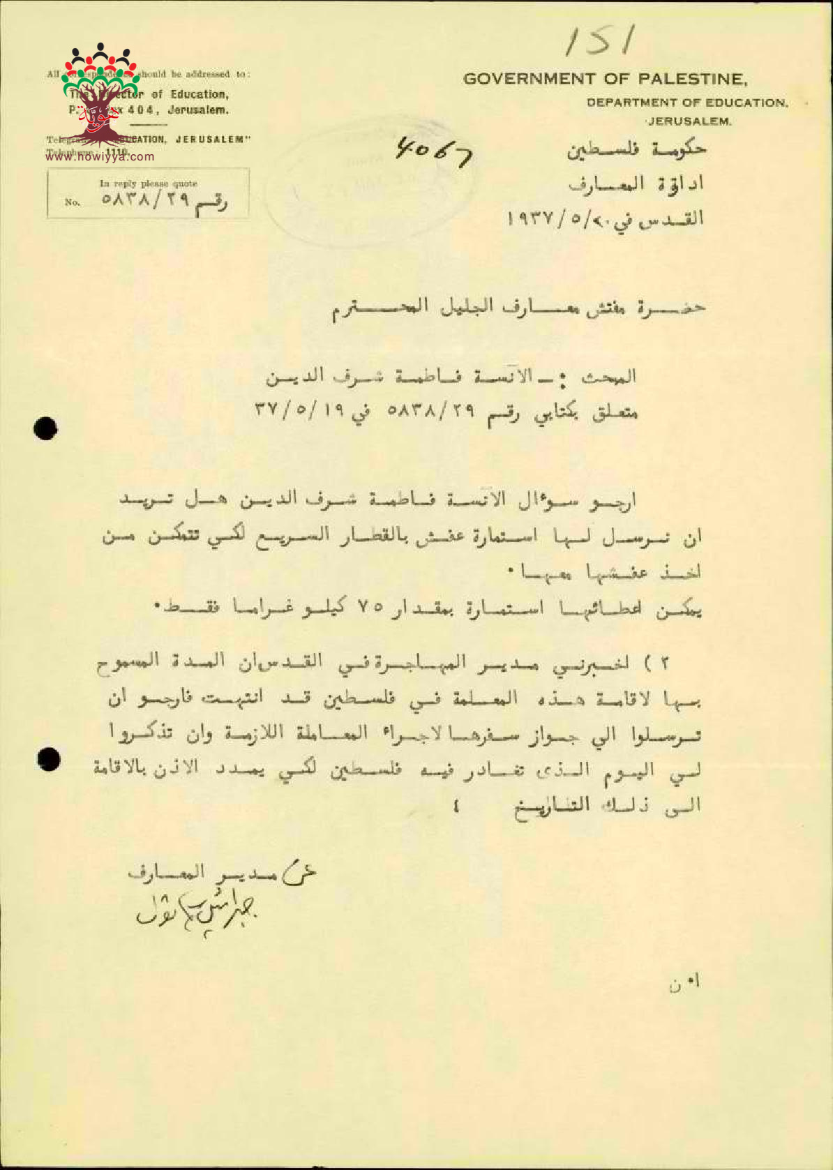 رسالة من مدير المعارف الى مفتش المعارف ليسأل المعلمة فاطمة شرف الدين عن استمارة نقل عفشها
