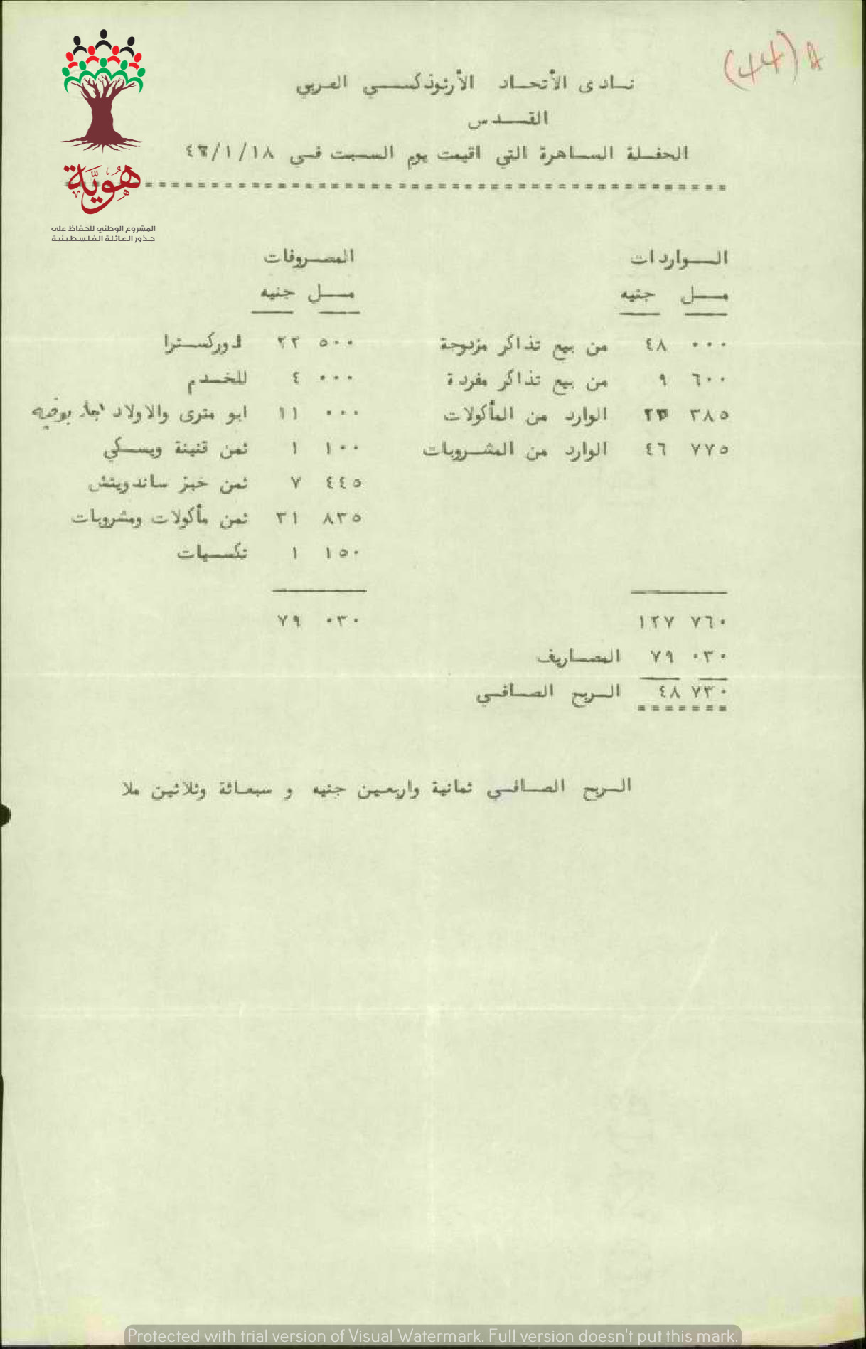 واردات ومصاريف الحفل الخيري الذي أقامه نادي الإتحاد الأرثوذكسي في القدس