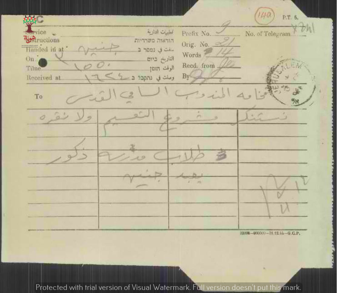 تلغراف مرسل من طلاب مدرسة ذكور يعبد/جنين الى المندوب السامي احتجاجا على قرار تقسيم فلسطين
