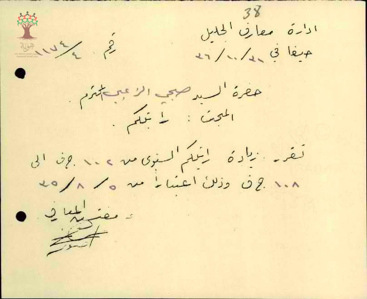 رسالة من مفتش المعارف الى المعلم صبحي الزعبي بخصوص زيادة راتبه السنوية