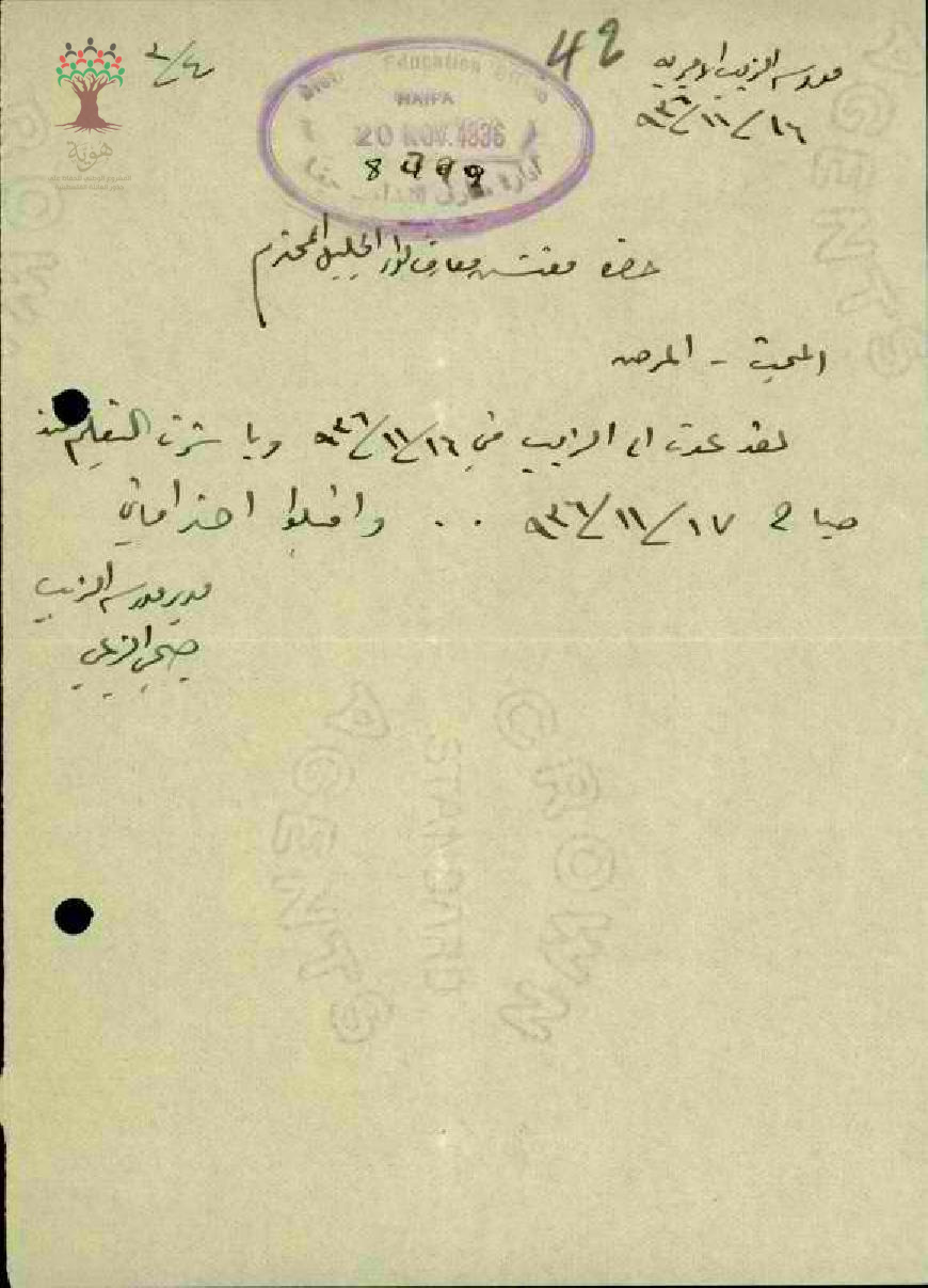 رسالة من المعلم صبحي الزعبي الى مفتش المعارف يخبره بعودته الى العمل