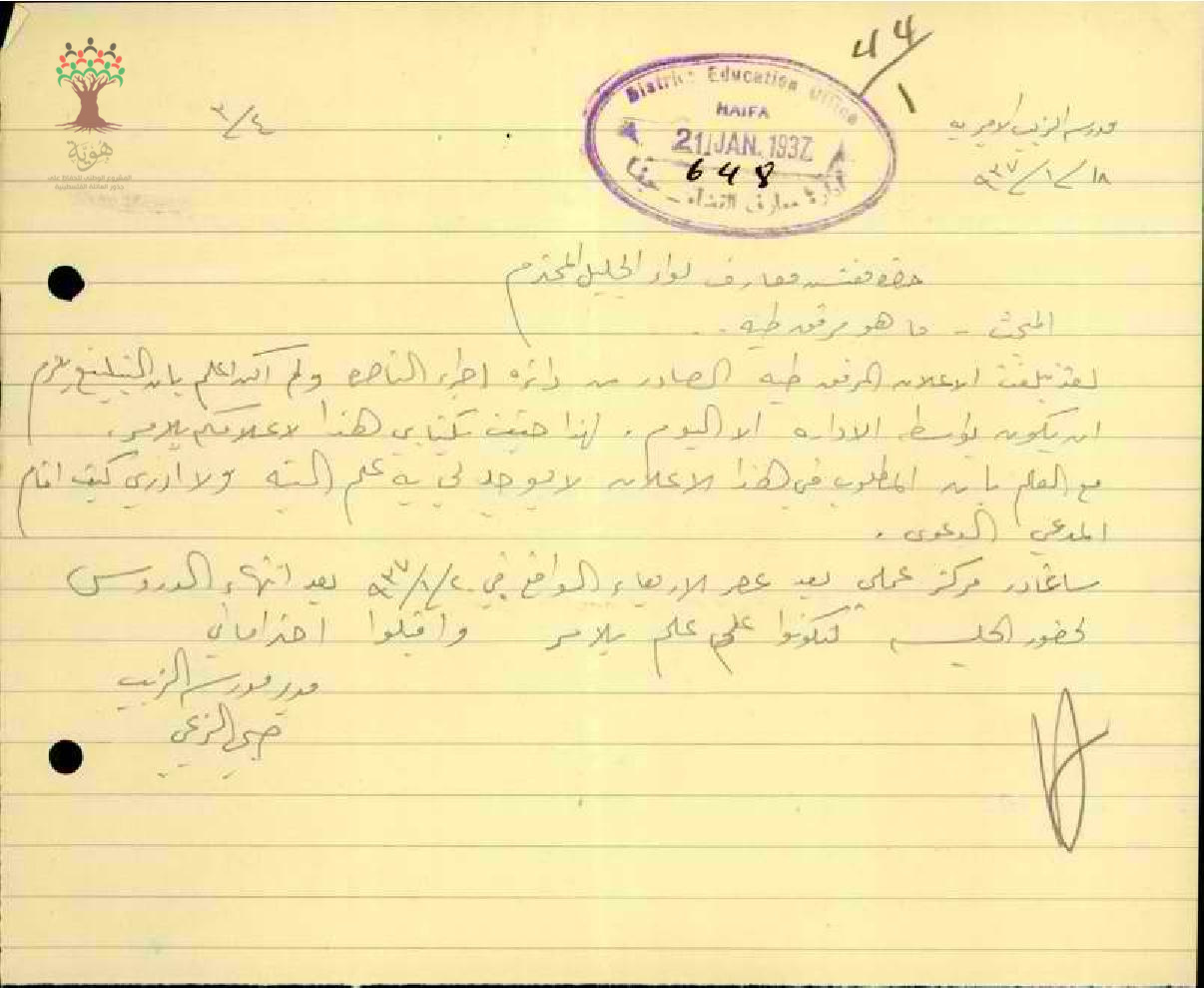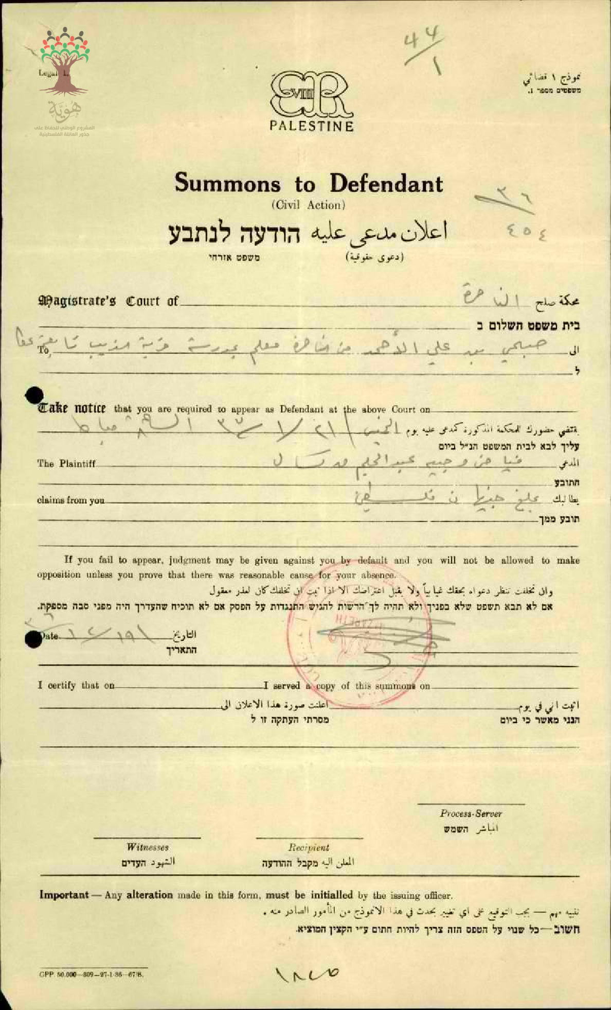 رسالة من المعلم صبحي الزعبي الى مفتش المعارف يطلب التغيب عن العمل لحضور جلسة ادعاء مرفقة ب إعلان المدعى عليه