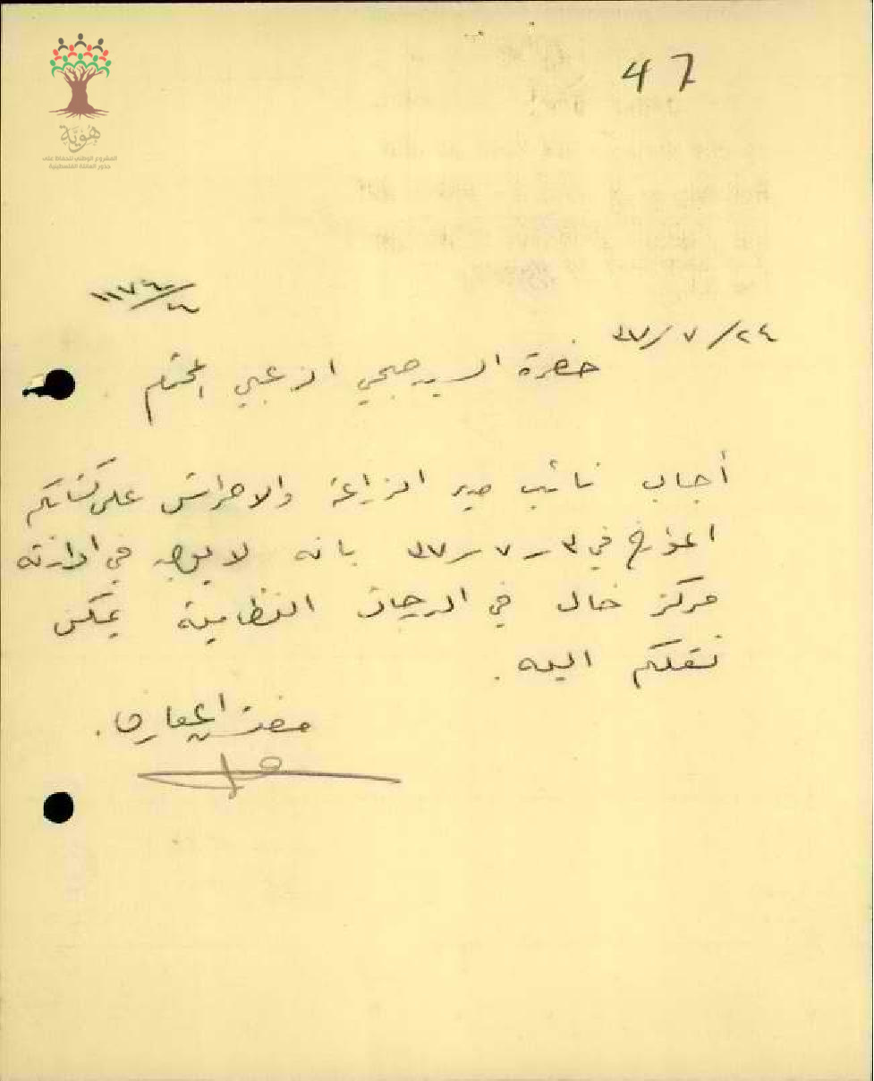 رسالة من مفتش المعارف الى المعلم صبحي الزعبي يخبره بأنه لا يوجد شاغر نظامي في دائرة الزراعة لنقله
