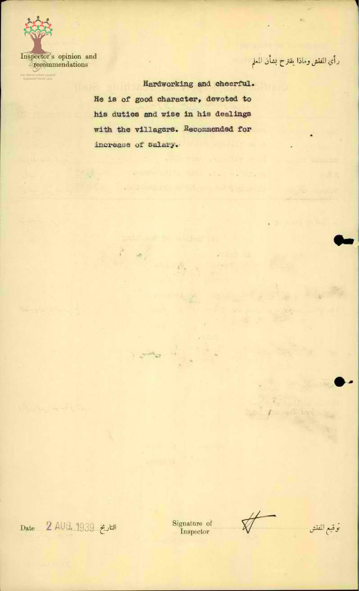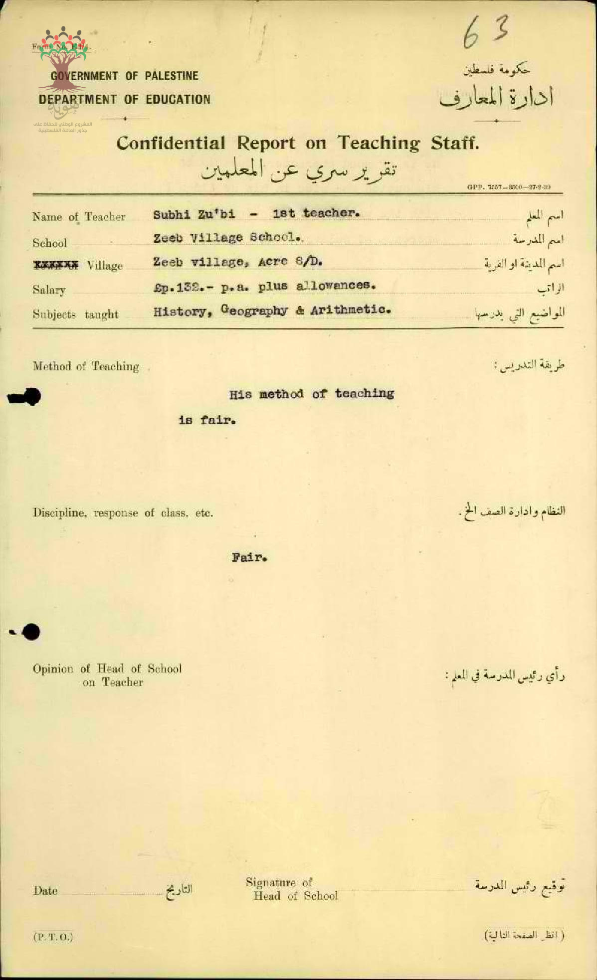 تقرير تفصيلي عن أداء المعلم صبحي الزعبي في مدرسة الزيب سنة 1939