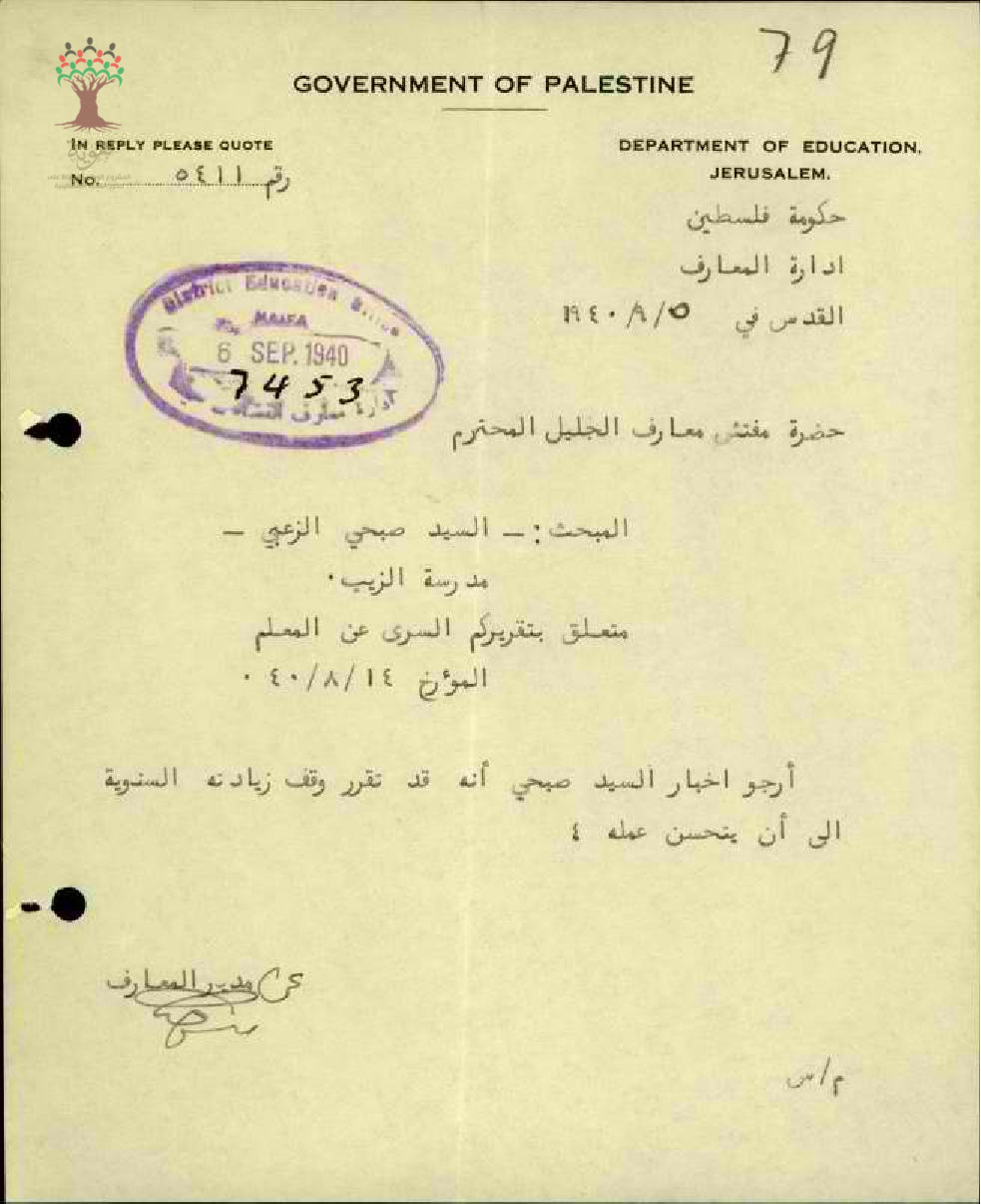 رسالة من مدير المعارف الى مفتش المعارف بخصوص ايقاف زيادة المعلم صبحي الزعبي السنوية