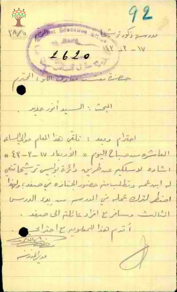 رسالة من مدير المدرسة الى مفتش معارف الجليل بخصوص تلقى هذا المعلم انور حديد الساعه العاشره من صباح اليوم الاربعاء رسالة لاسلكية عن وفاة ابن عمه في صفدمما اضطر تركه للمدرسة
