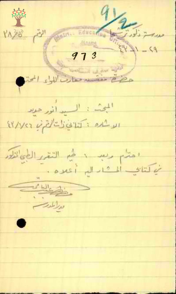 رسالة من مدير المدرسة الى مفتش معارف الجليل بخصوص المعلم انور حديد وطية التقرير الطبي المذكور في كتابي المشار اليه