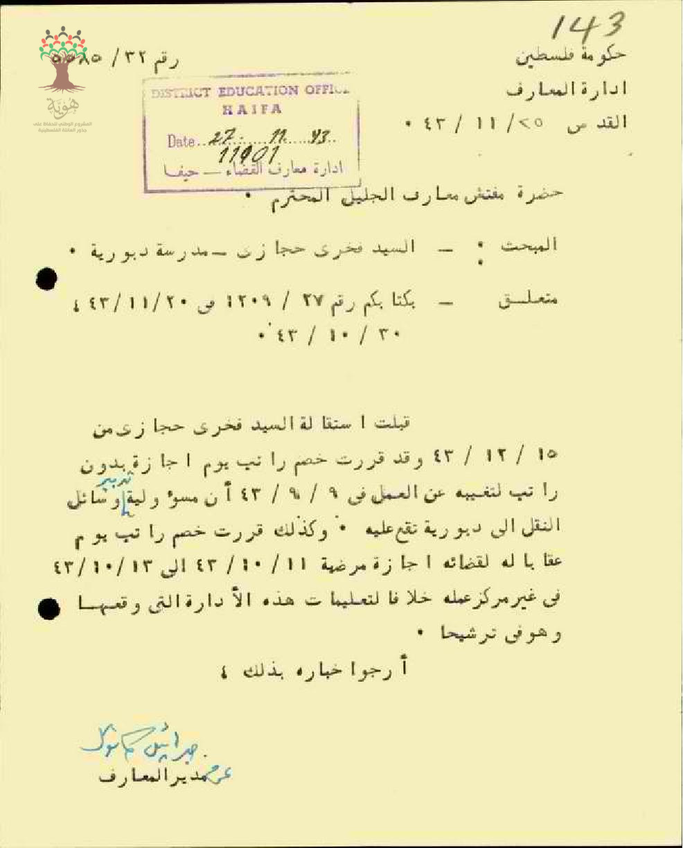 رسالة من مدير المعارف الى مفتش معارف الجليل بخصوص السيد فخري حجازي مدرسة دبورية متعلق بكتاب استقالة السيد فخري حجازي من المدرسة