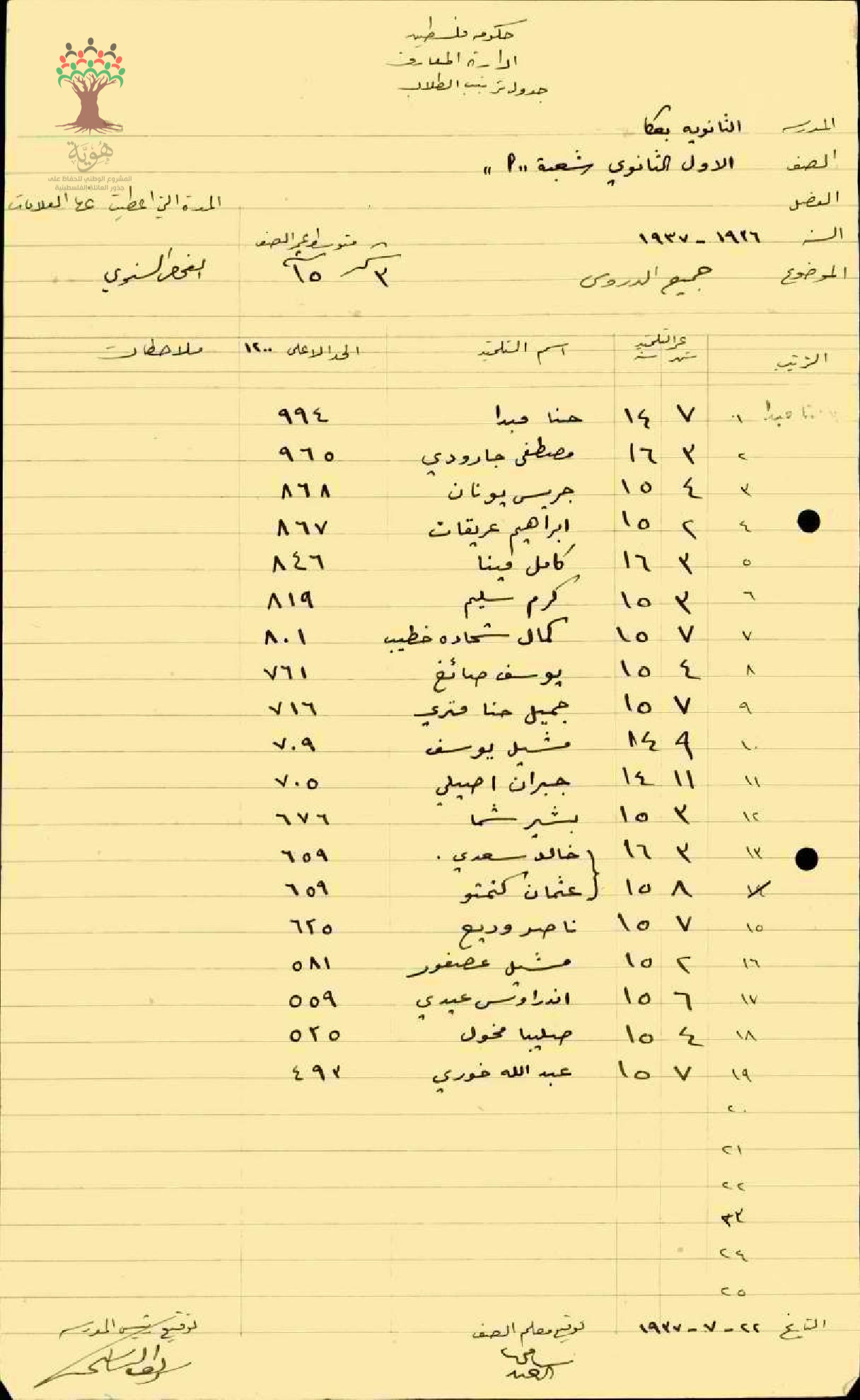 وثيقة جدول ترتيب الطلاب مدرسة الثانوية بعكا لسنة 1936الى1937 الصف الاول الثانوي شعبة p الموضوع جميع الدورس