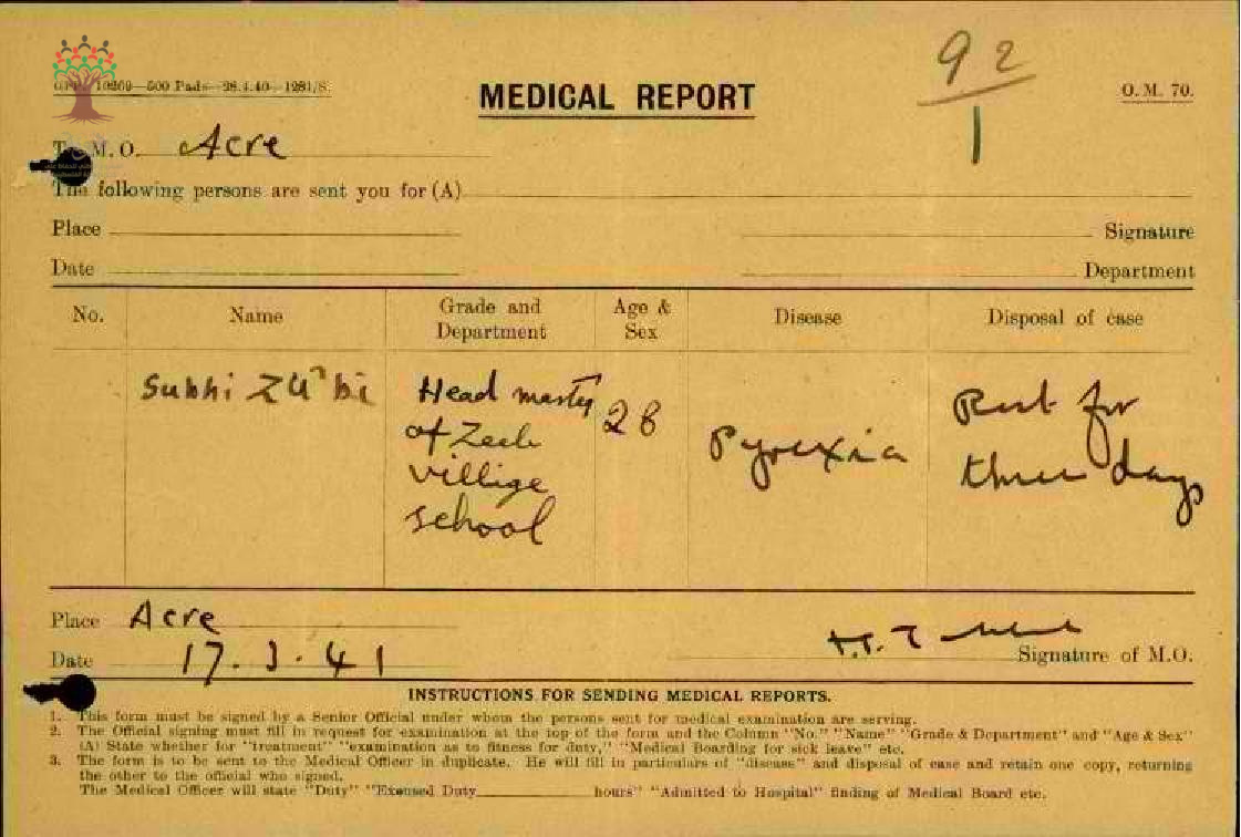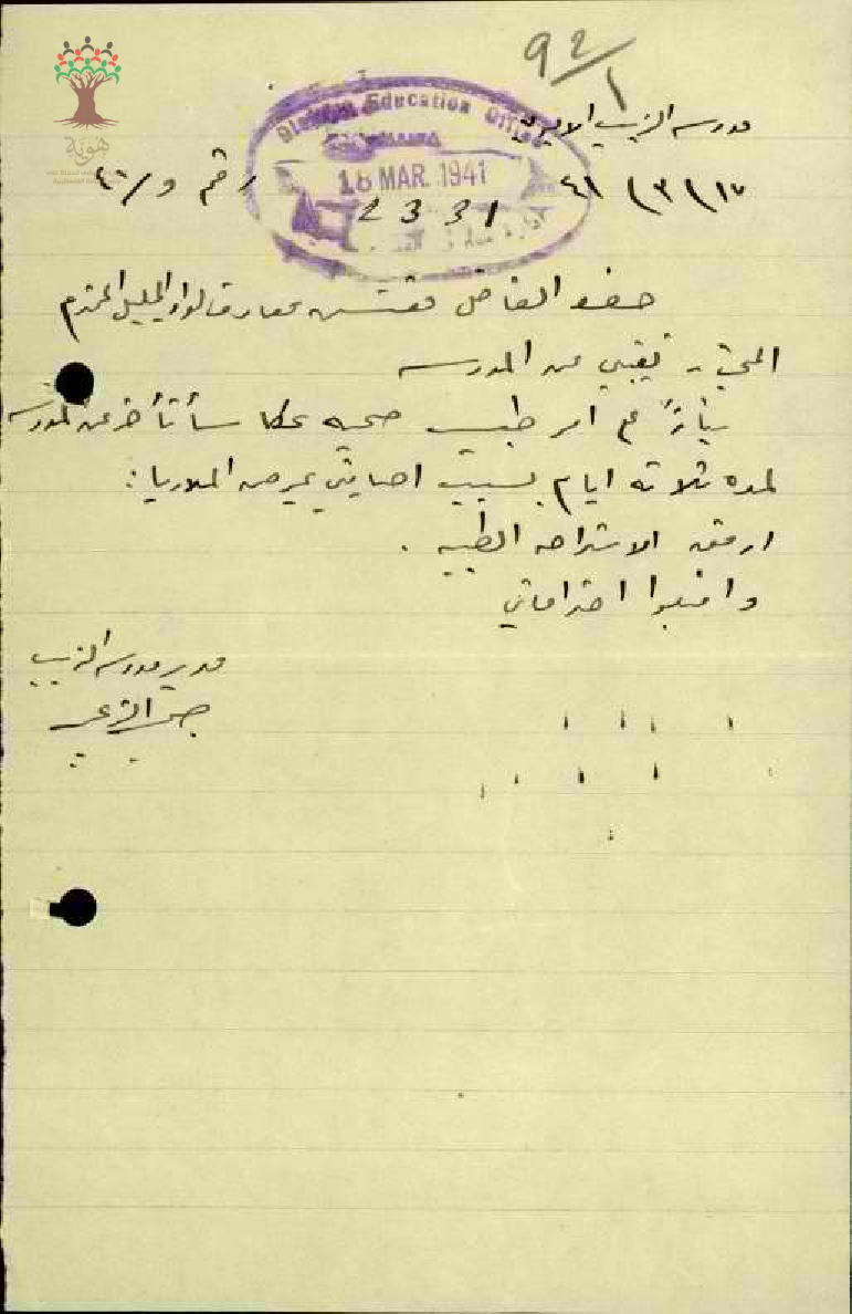 رسالة من المعلم صبحي الزعبي الى مفتش المعارف بخصوص تغيبه عن العمل مرفقة بالتقرير الطبي