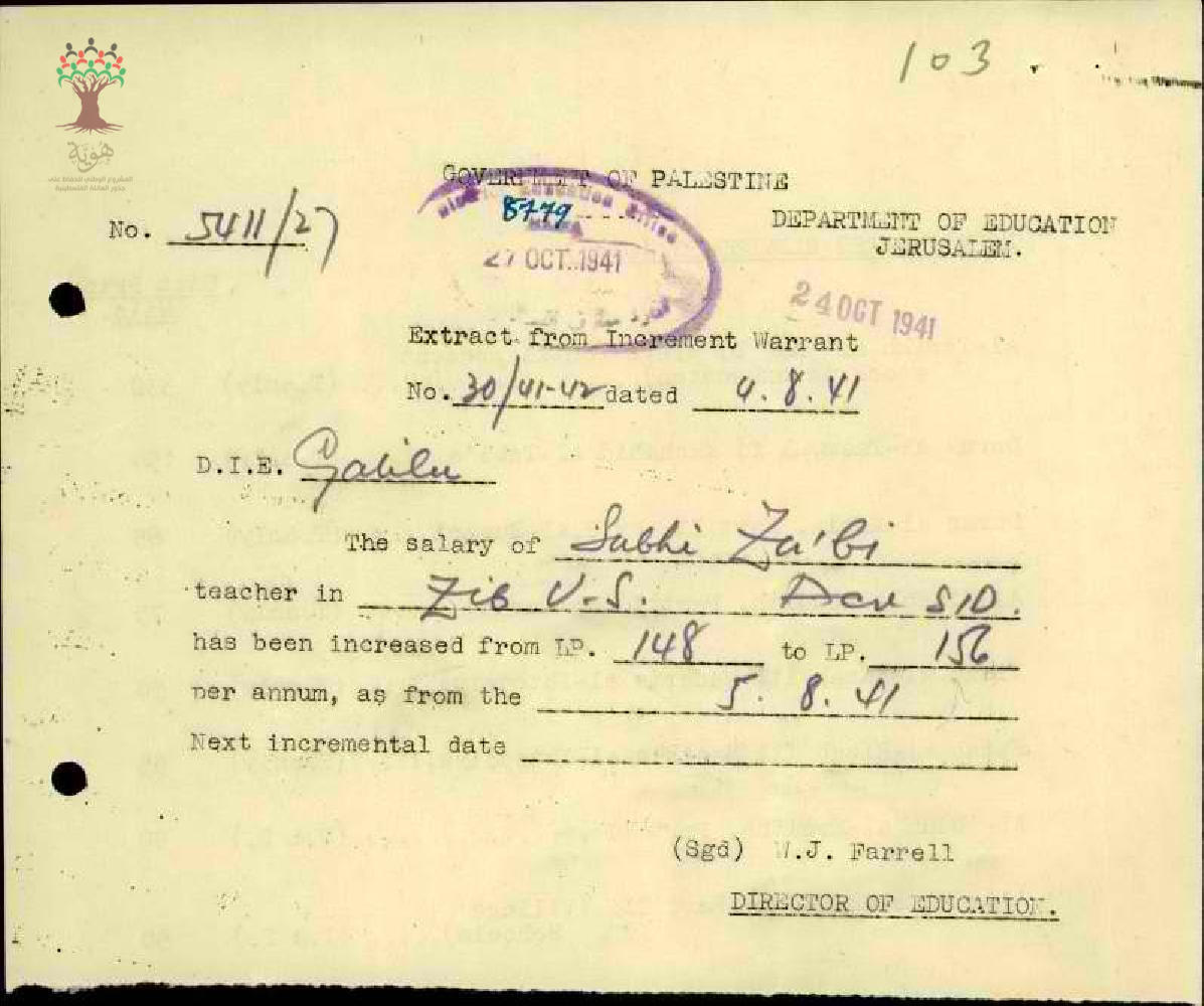 رسالة من مدير المعارف الى مفتش المعارف بخصوص زيادة راتب المعلم صبحي الزعبي السنوية