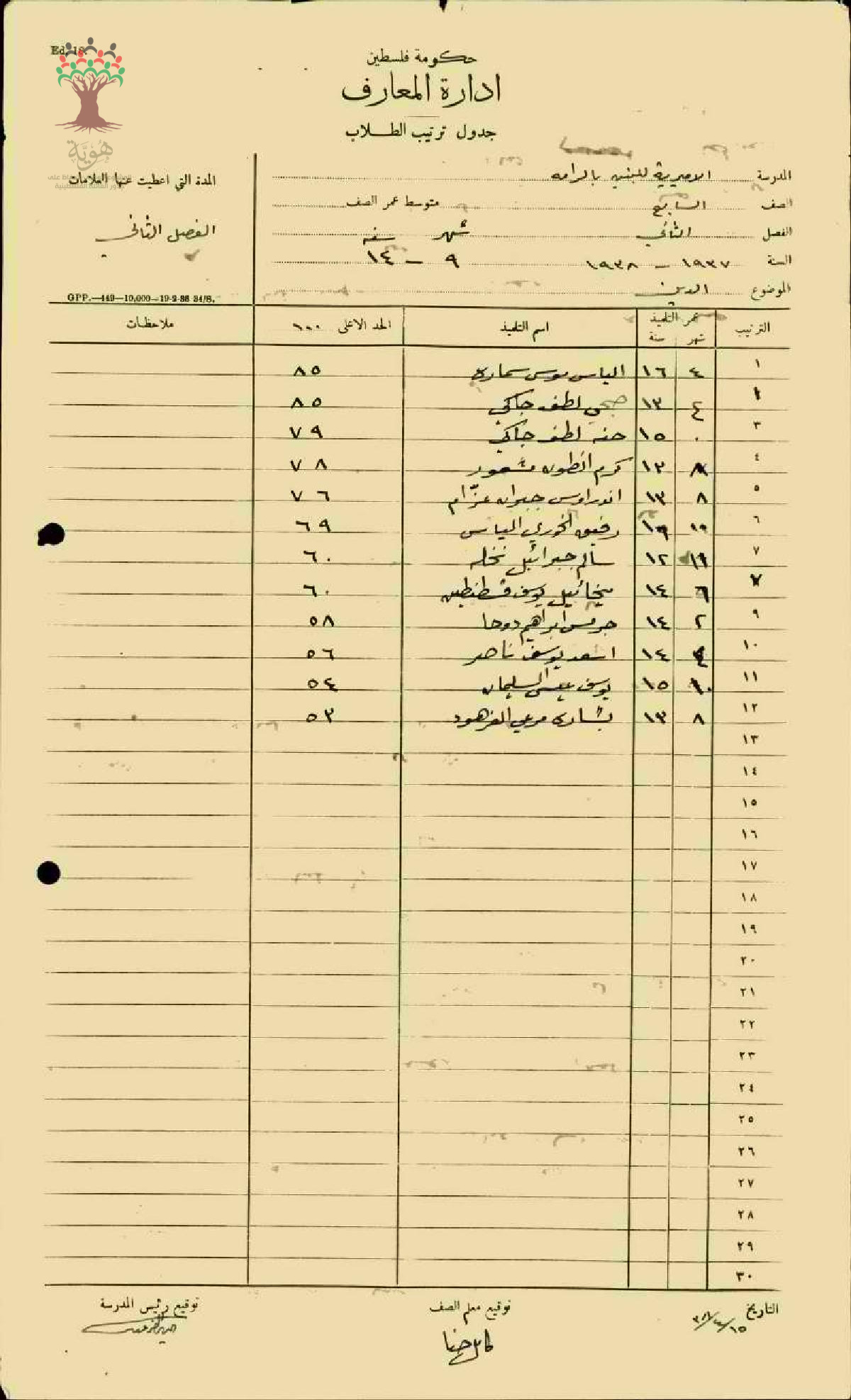 جدول ترتيب الطلاب في مدرسة الرامة الصف السابع الفصل الثاني لعام 1937 -1938