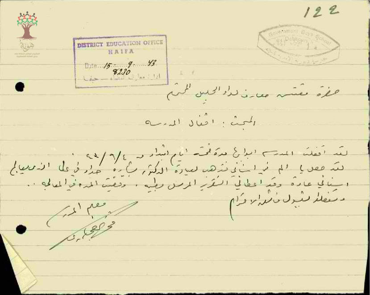 رسالة من المعلم فخري حجازي الى مفتش معارف الجليل بخصوص اقفال المدرسة مدة خمسة ايام