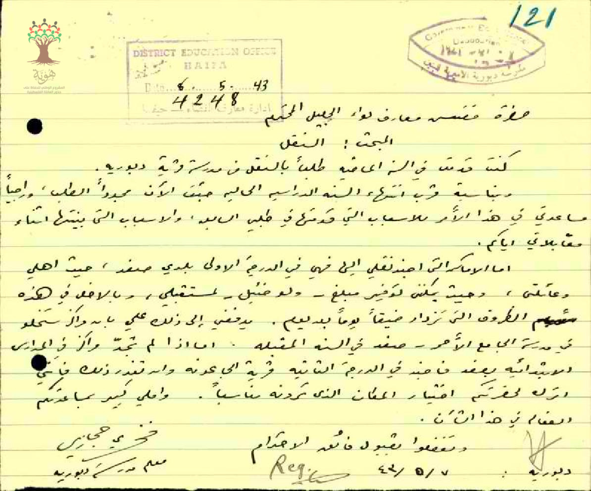 رسالة من المعلم فخري حجازي الى مفتش معارف الجليل بخصوص طلب النقل وكنت قدمت في السنه الماضيه طلب بالنقل من مدرسة دبوريه
