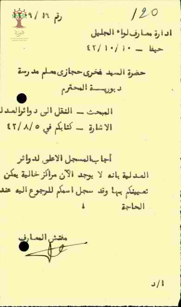 رسالة من مفتش المعارف الى ادارة معارف الجليل بخصوص نقل المعلم فخري حجازي الى لدوائر العدلية بانه لا يوجد الان مركز خالية