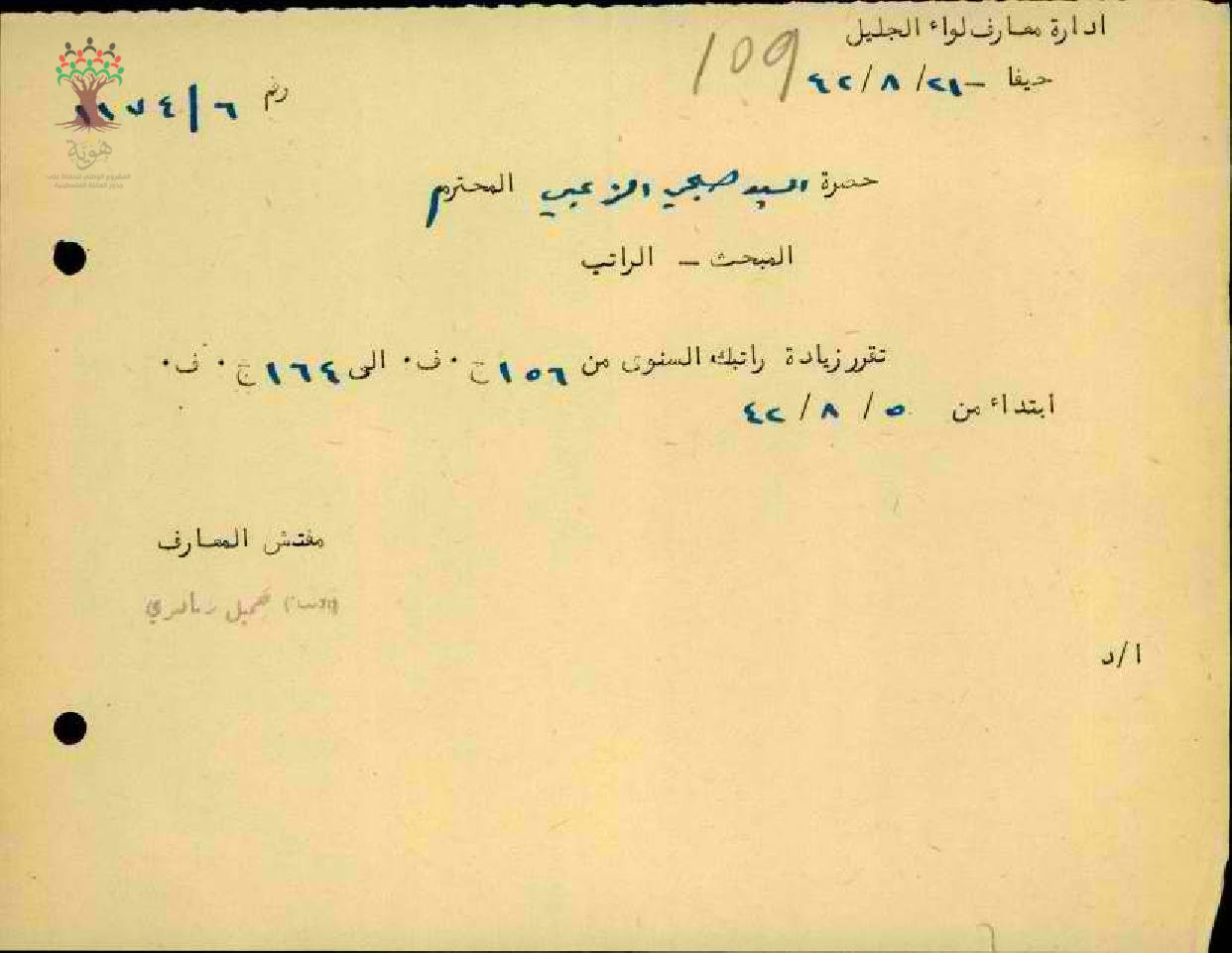 رسالة من مفتش المعارف الى المعلم صبحي الزعبي بخصوص زيادة راتبه السنوية