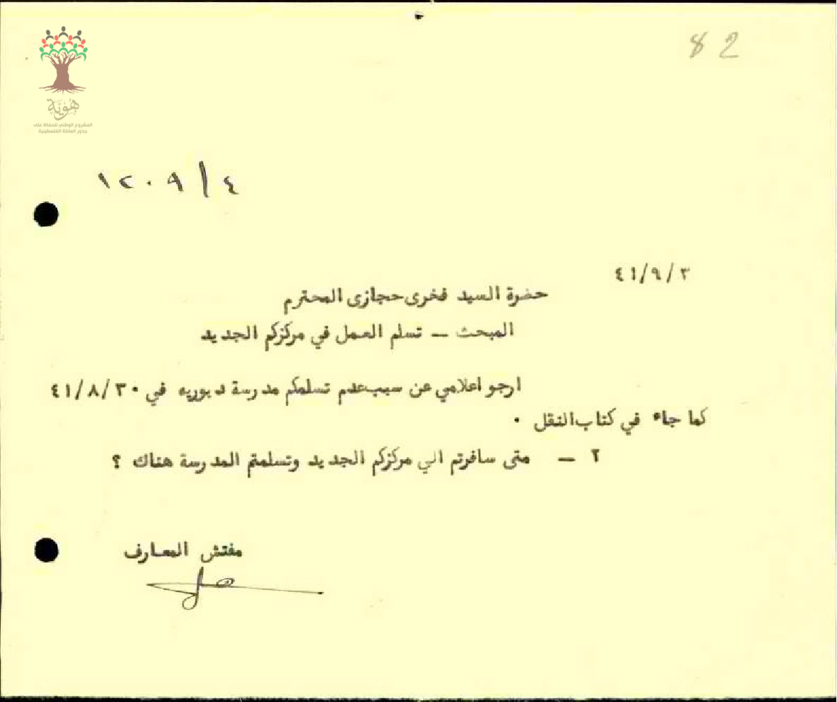 رسالة من مفتش المعارف اللى حضرة السيد فخري حجازي المحترم بخصوص اعلامي عن سبب عدم تسلمكم مدرسة دبورية