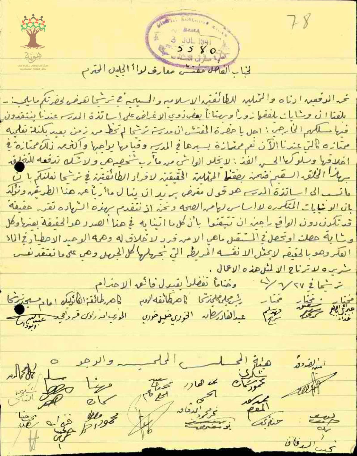 رسالة من مخاتير ووجهاء ترشيحا لجناب حضرة مفتش معارف لواء الجليل المحترم بانهم بليغو ان وشايات يلفقها زورا وبهتانا بعض ذوي الاغراض على اساتذة المدرسة في مسلكهم الخاري