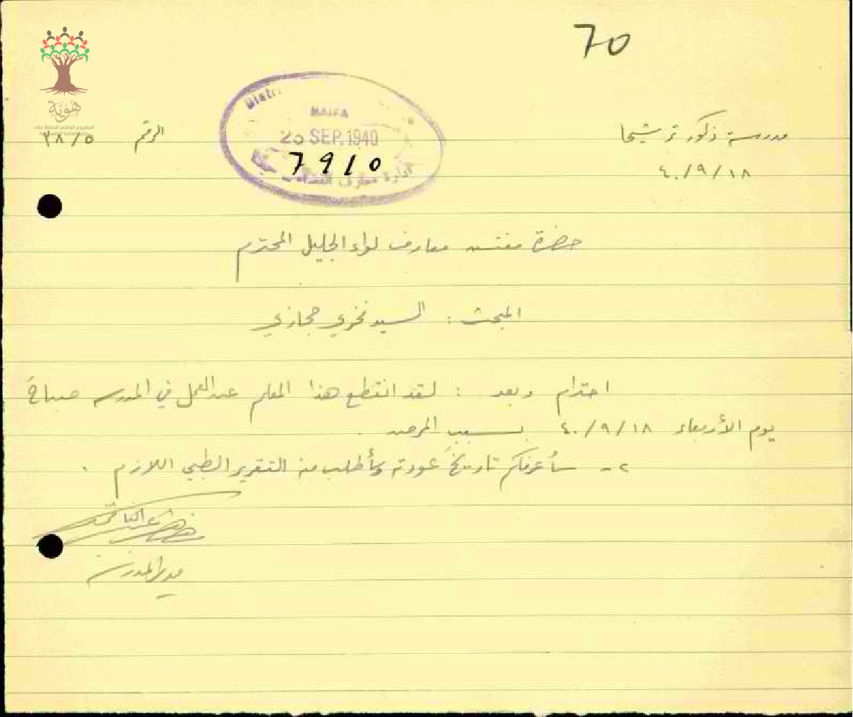 رسالة من مدير المدرسة الى حضرة مفتش معارف لواء الجليل بخصوص انقطاع المعلم فخري حجازي عن الدوام في المدرسة في صباح الاربعاء 18\9\1940 بسبب المرض