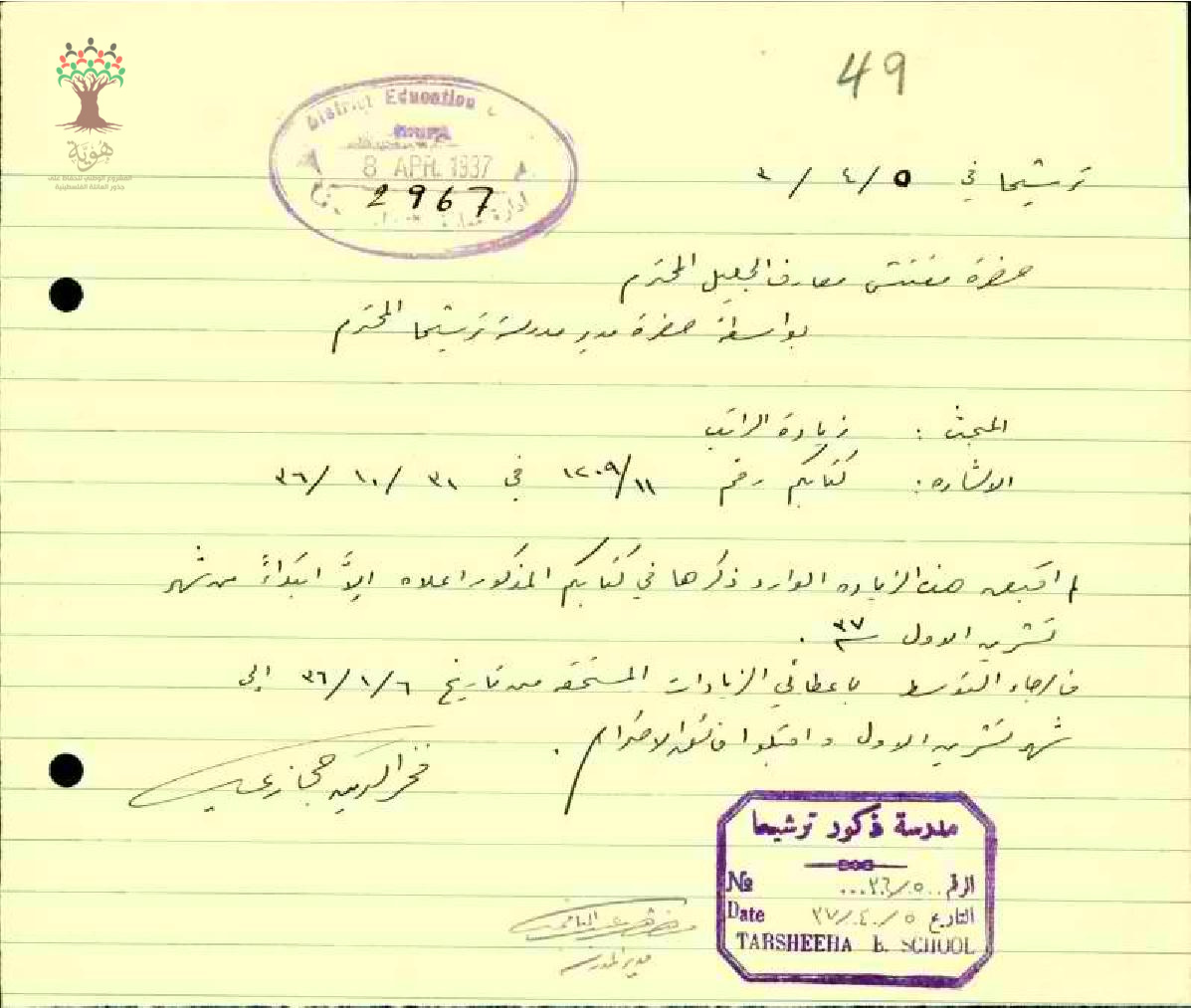 رسالة من المعلم فخري حجازي الى حضرة مفتش معارف لواء الجليل المحترم بواسطة مدير مدرسة ترشيحا المبحث بخصوص زيادة الراتب