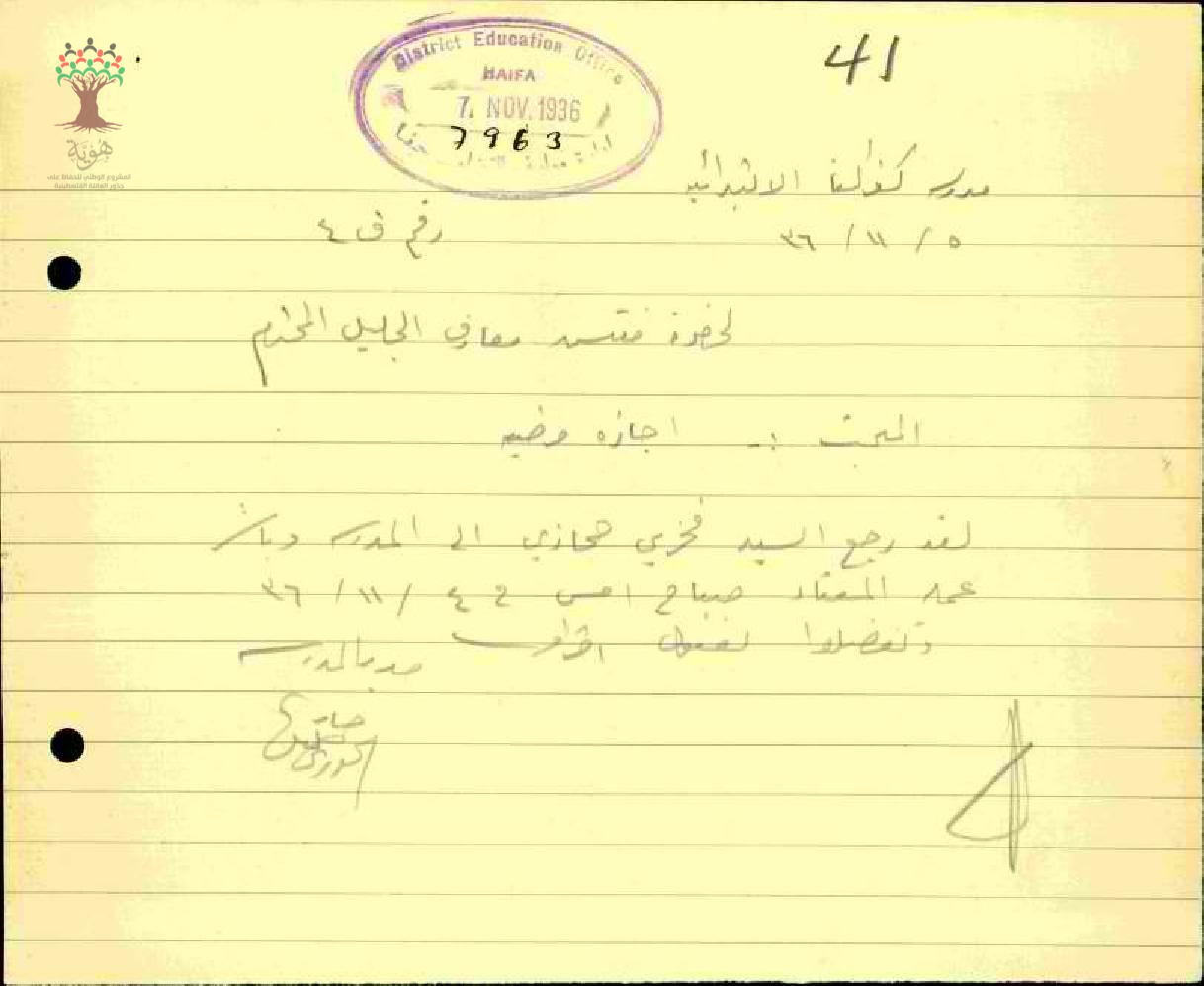 رسالة من مدير المدرسة الى حضرة مفتش معارف لواء الجليل المحترم المبحث بخصوص عودة المعلم فخري حجازي الى المدرسة بعد الاجازة صباح امس 42\11\1936