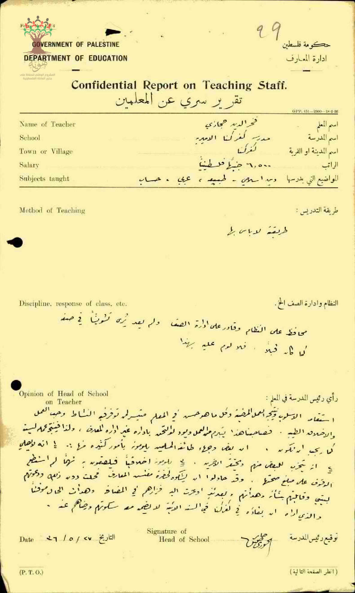 حكومة فلسطين ادارة المعارف تقرير سري عن المعلمين وبخصوص المعلم فخري حجازي