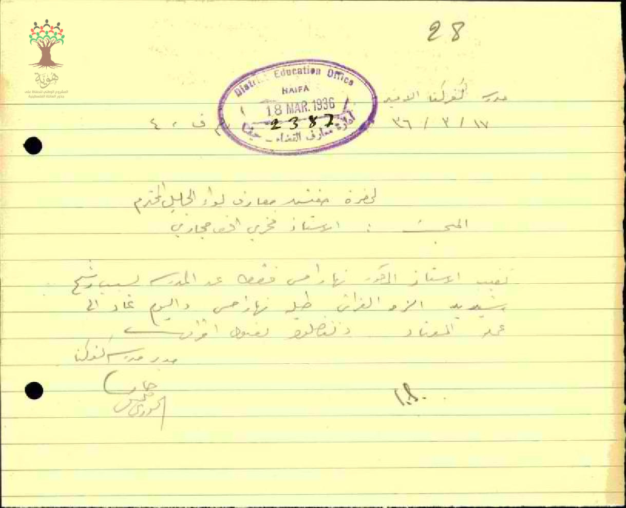 رسالة من مدير المدرسة الى حضرة مفتش معارف لواء الجليل المحترم المبحث بخصوص غياب المعلم فخر حجازي عن المدرسة بسبب رشح شديد الزمه الفراش