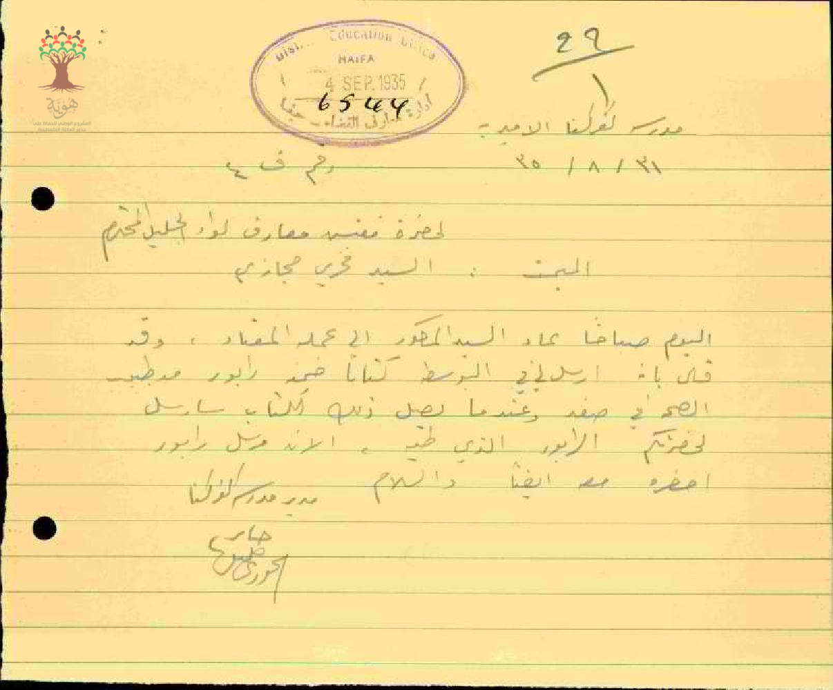 رسالة من مدير المدرسة الى حضرة مفتش معارف لواء الجليل المحترم المبحث بخصوص عودة المعلم فخري حجازي الى المدرسة