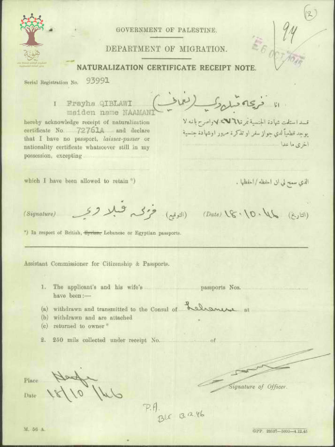 وثيقة استلام الجنسية الفلسطينية من قبل المواطنة اللبنانية فريحة قبلاوي ( نعماني )