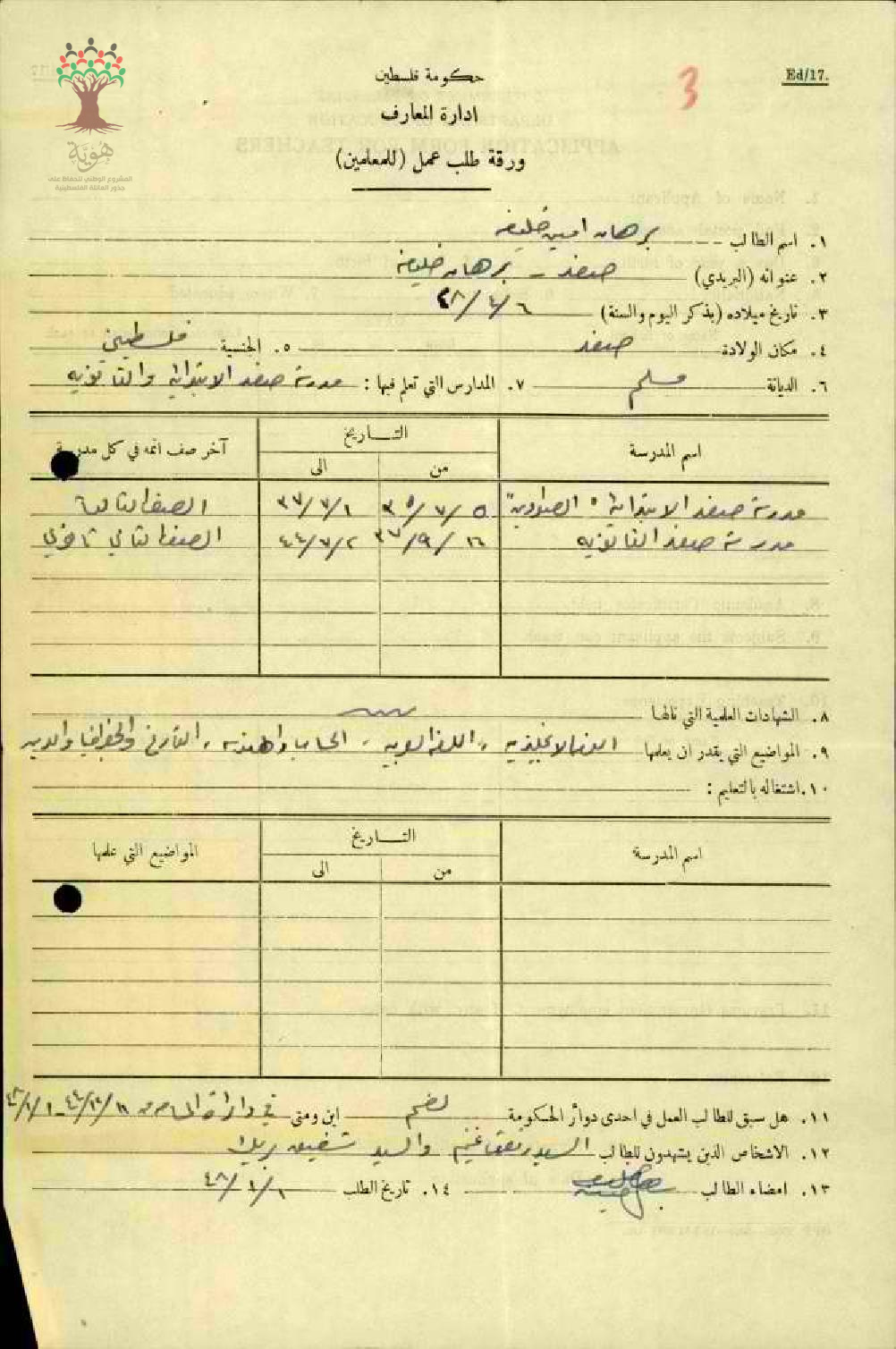 ورقة طلب عمل للمعلم برهان أمين خليفة/صفد
