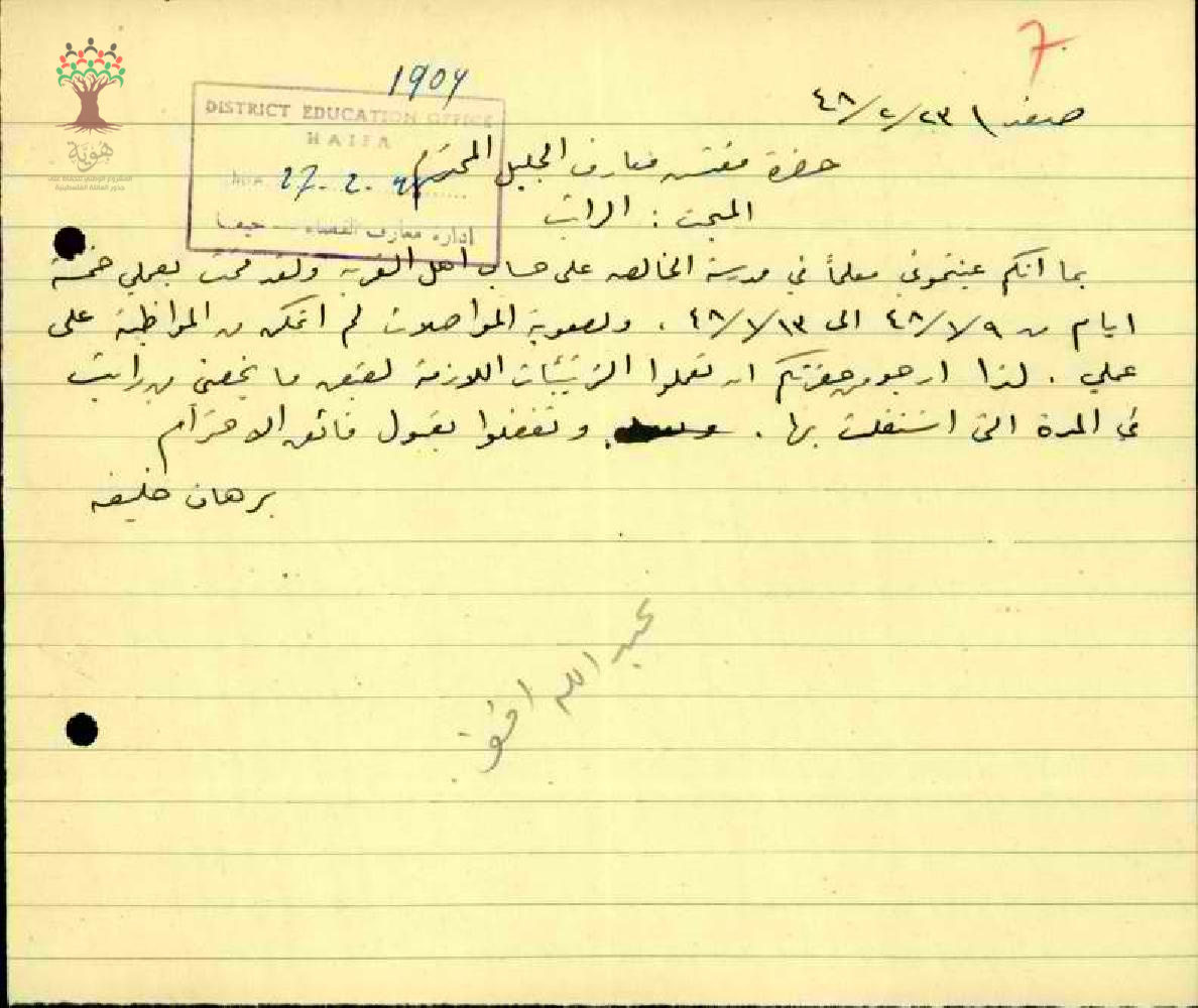 رسالة من المعلم برهان خليفة إلى مفتش المعارف يبحث معه أمر الراتب وطريقة حصوله عليه