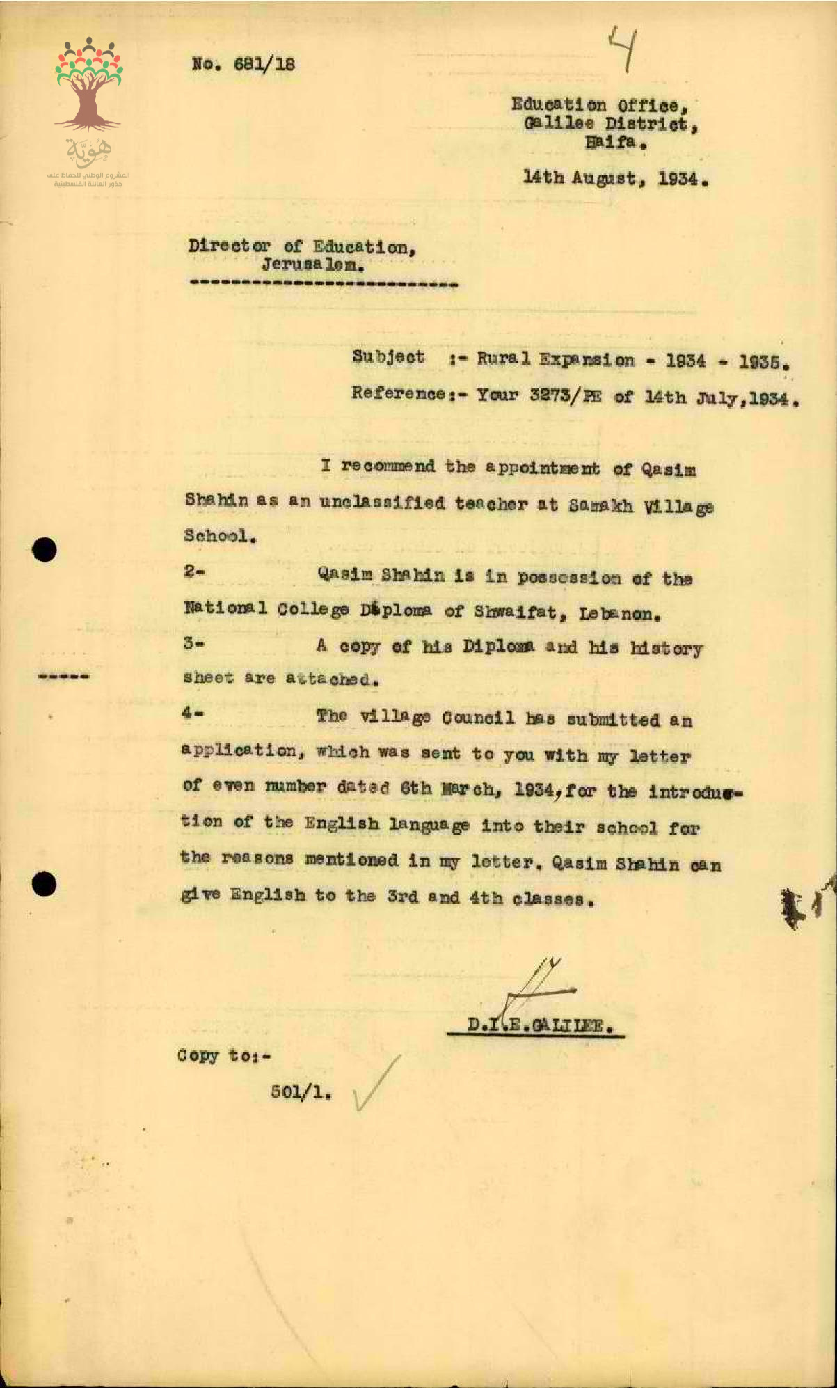 Appointment of Kasim Shahin teacher of samakh village school to introduce the English classes