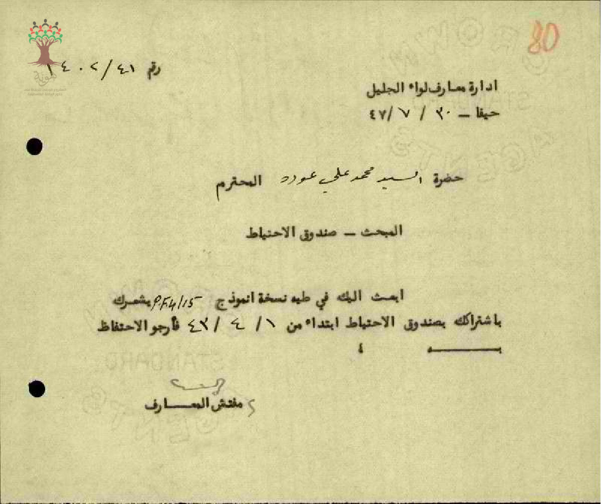 رسالة من مفتش المعارف الى المعلم محمد علي عودة بخصوص الاشتراك بصندوق الاحتياط