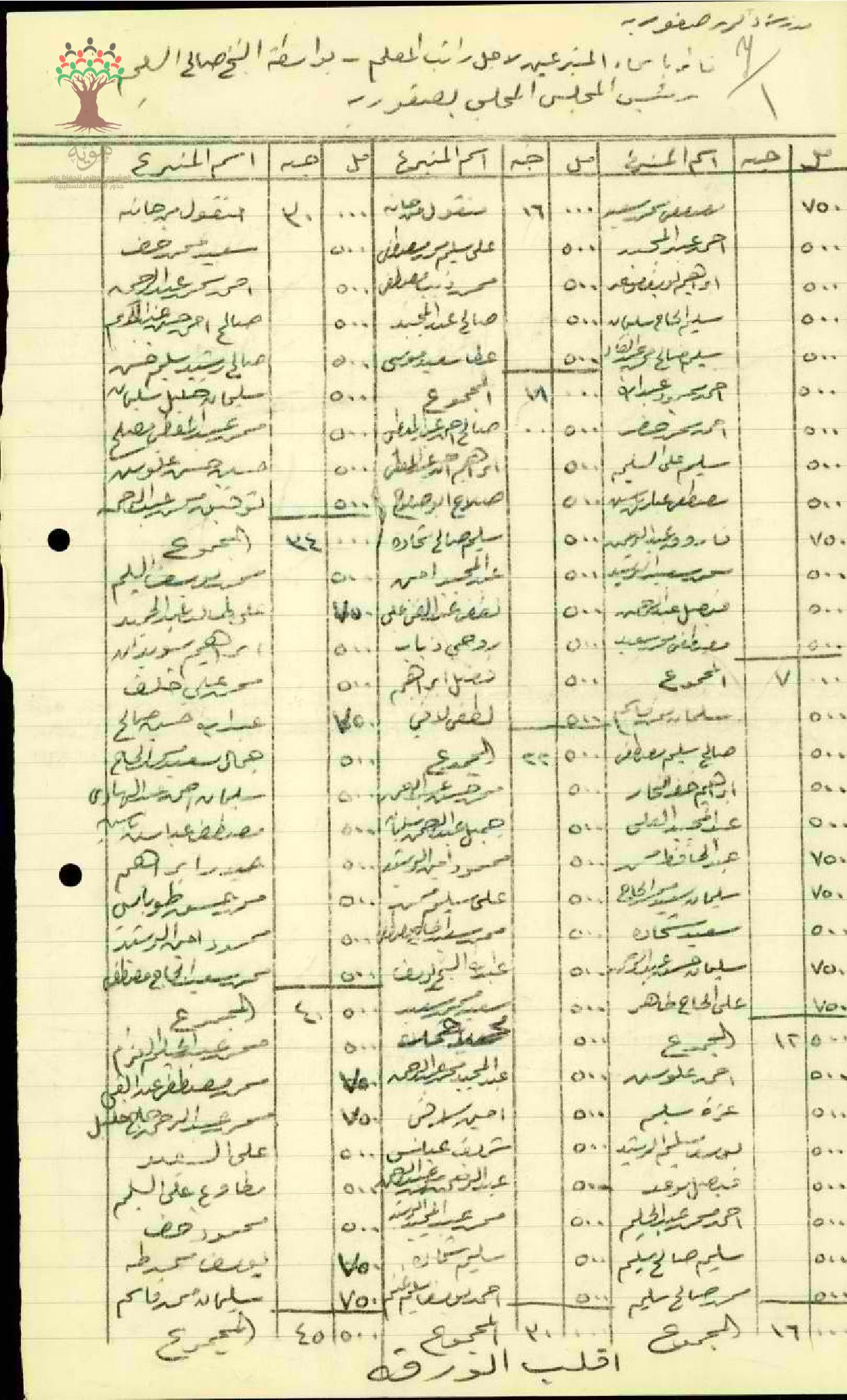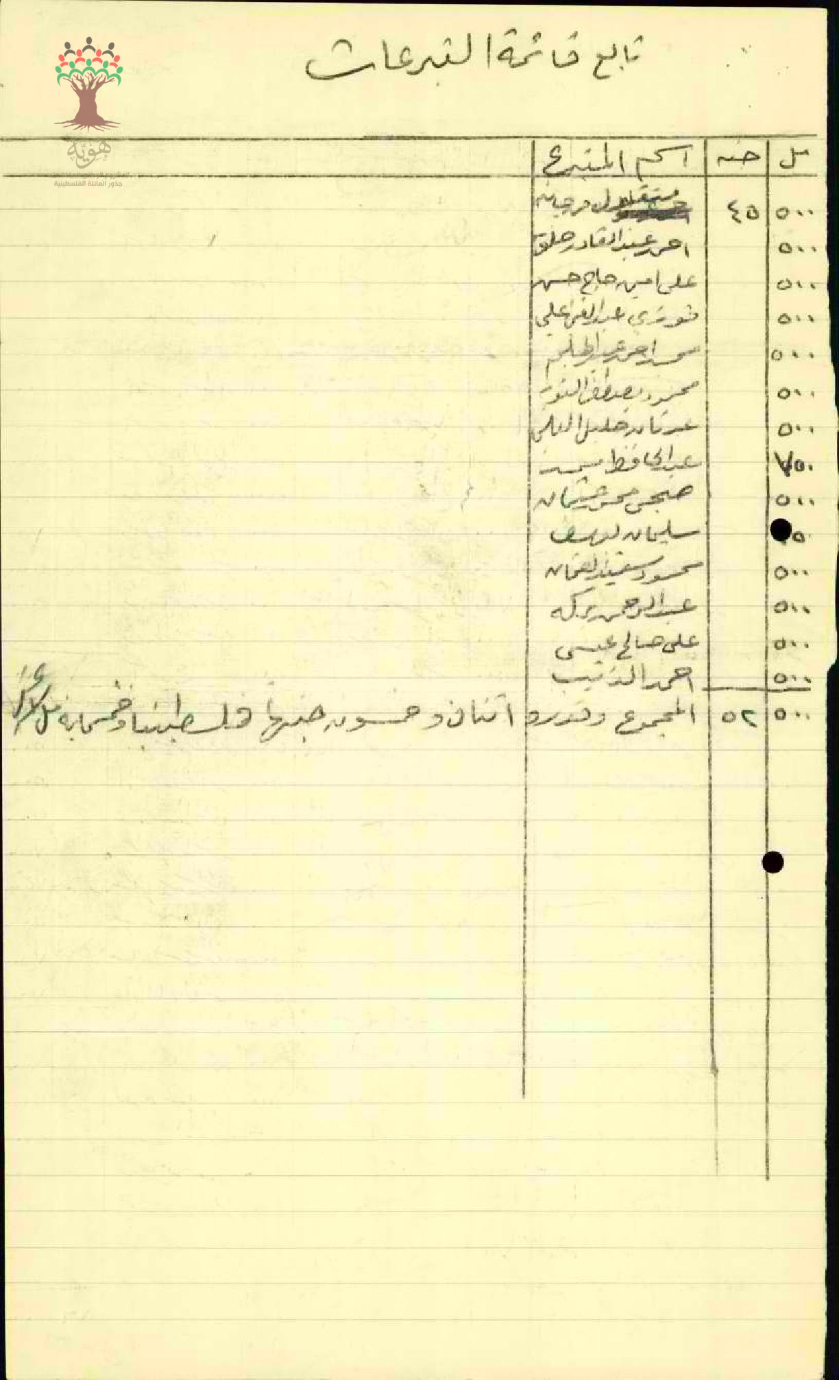 قائمة باسماء المتبرعين لصالح راتب المعلم محمد الشيخ يوسف الخطيب، تتضمن القائمة باسماء وقيمة التبرعات المدفوعة.