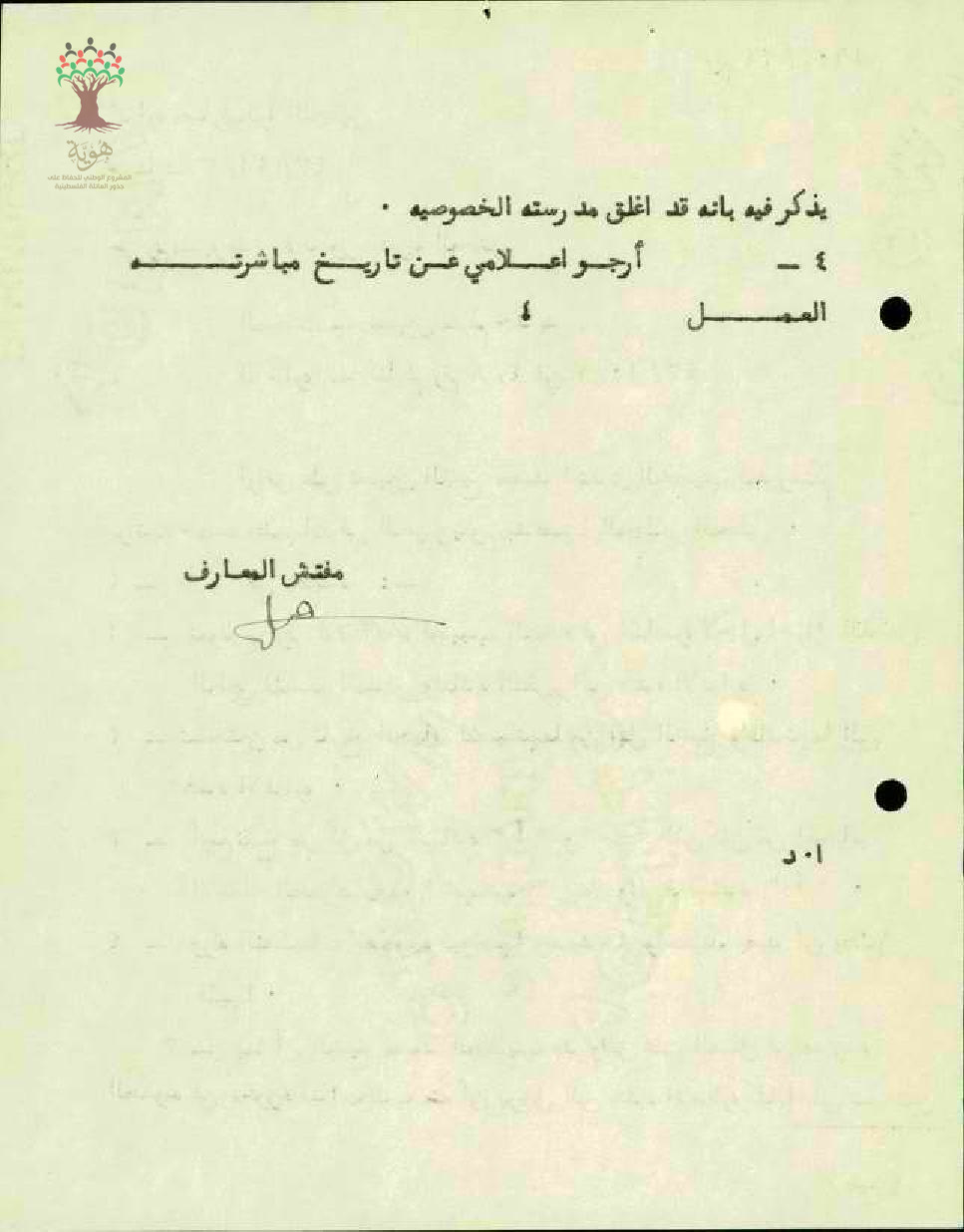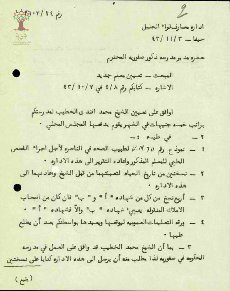 رسالة الموافقة على طلب تعيين محمد الشيخ يوسف الخطيب معلما في مدرسة ذكور صفورية