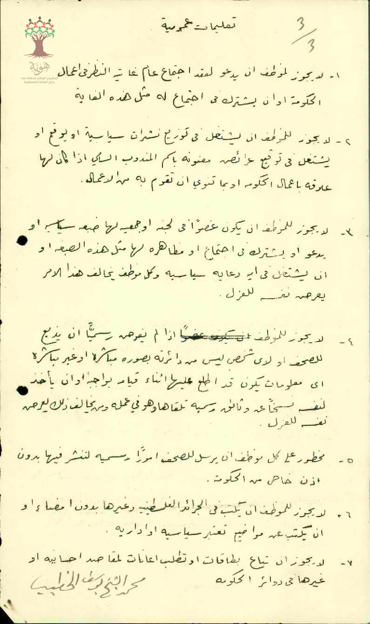 ورقة تعليمات عمومية صادرة عن حكومة فلسطين خاصة بالموظفين العموميين لدى حكومة فلسطين