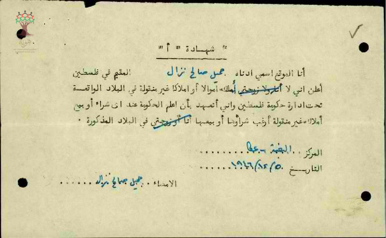 شهادة "أ" نفي ملكية للمعلم جميل نزال/نحف