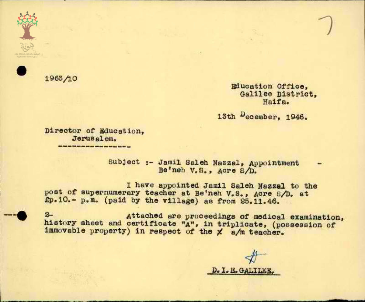 رسالة من مفتش المعارف إلى مدير المعارف يبحث معه تعيين المعلم جميل نزال في الإدارة