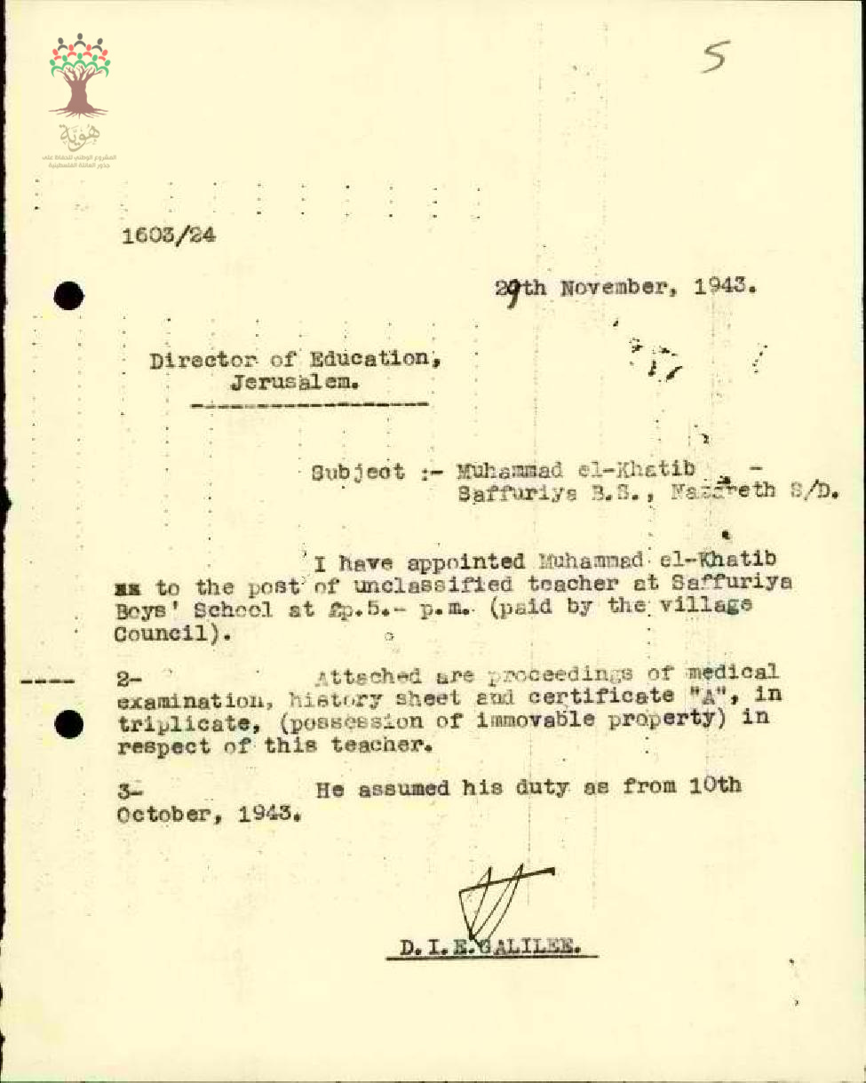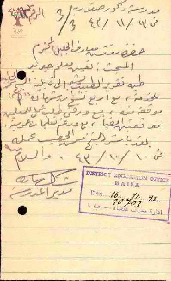 مرفق تقرير طبي يشير الى قابلية الشيخ محمد الخطيب للخدمة كمعلم في مدرسة ذكور صفورية