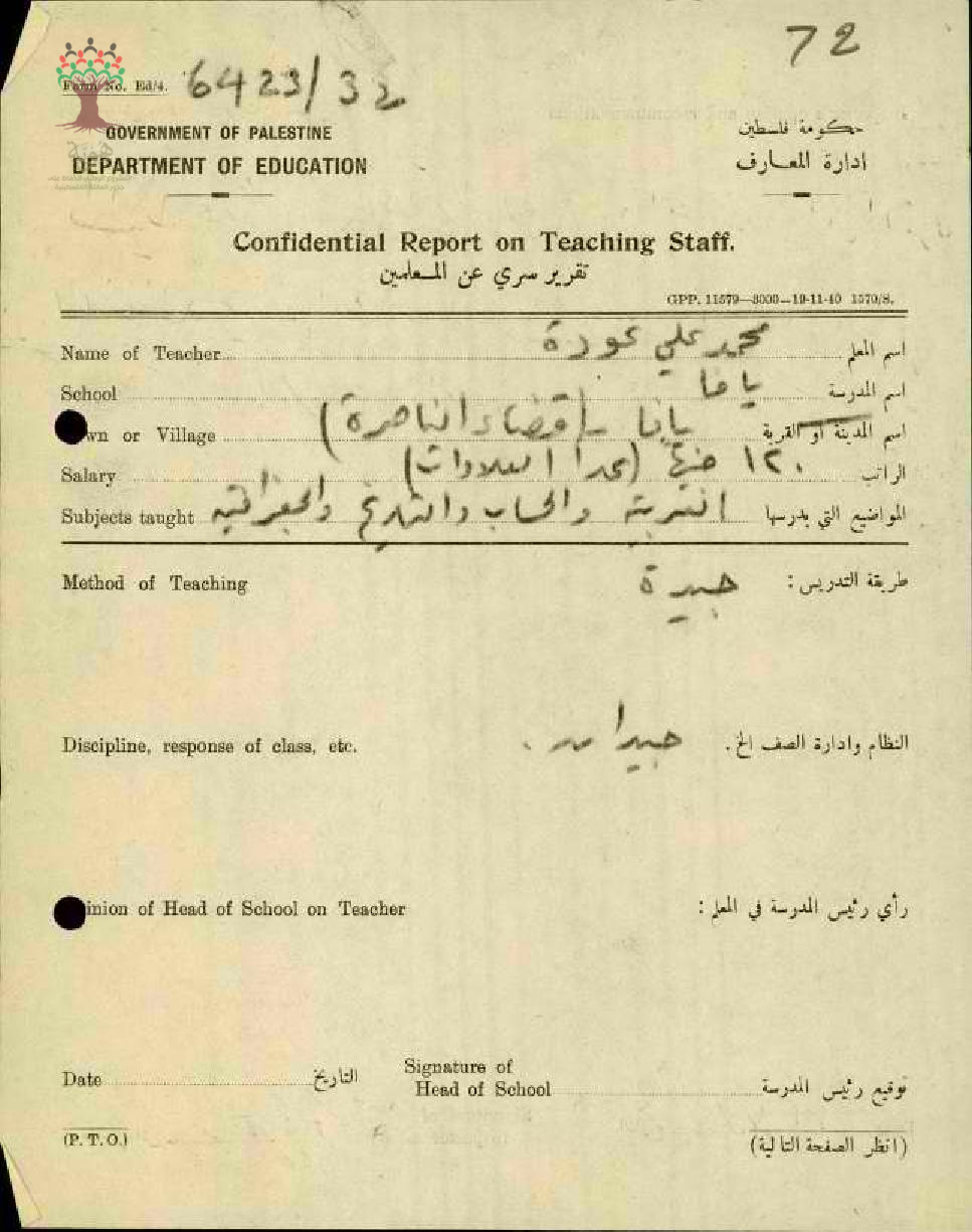 تقرير سري عن المعلم محمد علي عودة في مدرسة يافا _وطريقة التدريس _جيدة