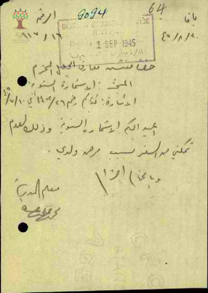 رسالة من المعلم محمد علي عودة الى مفتش معارف الجليل بخصوص اعادة الاستمارة السنوي وذلك لعدم تمكني من السفر بسبب مرض والدي