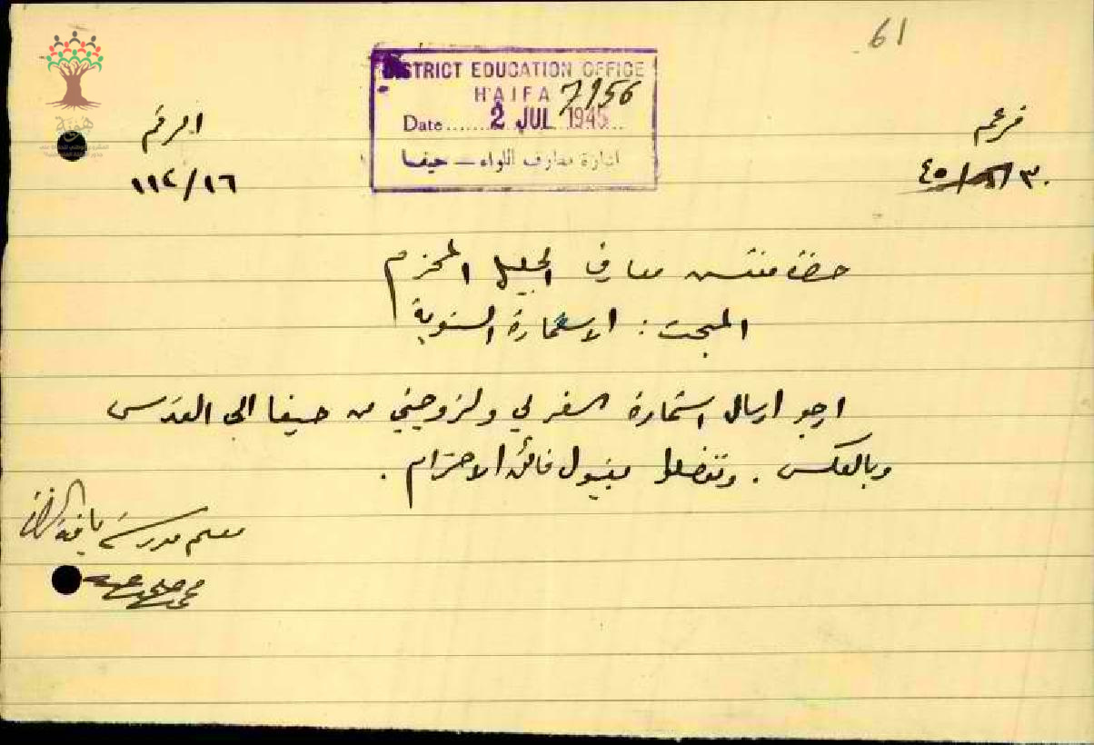 رسالة من المعلم محمد علي عودة الى مفتش معارف الجليل بخصوص ارسل استمارة سفر لي ولزوجتي من حيفا الى القدس