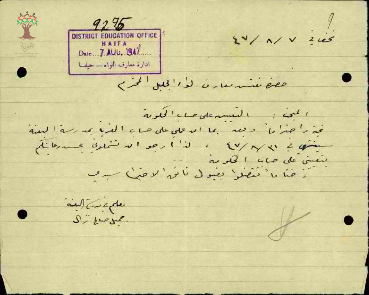 رسالة من المعلم جميل نزال إلى مفتش المعارف يطلب تعيينه معلماً على حساب الحكومة
