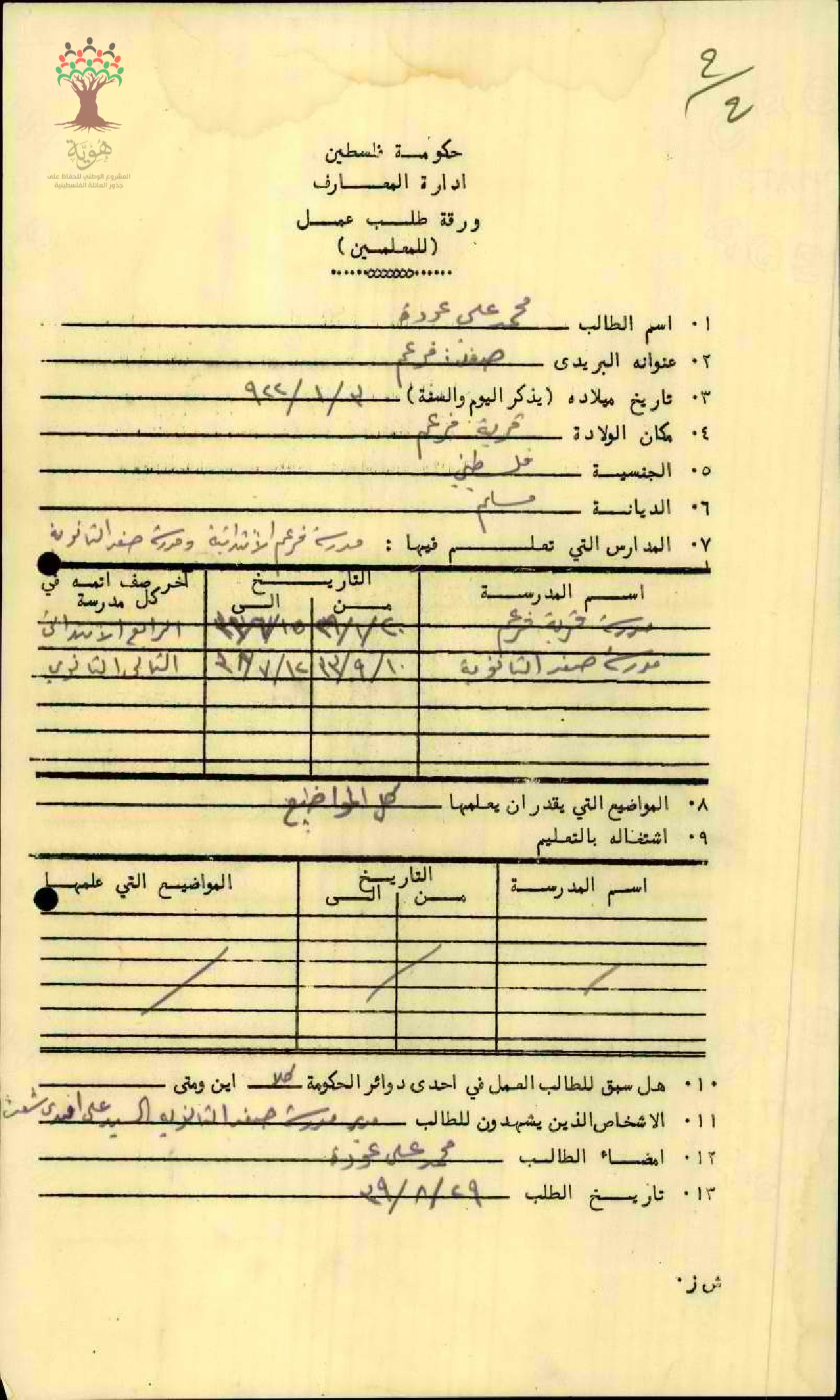 ادارة المعارف ورقة طلب عمل للمعلم محمد علي عودة