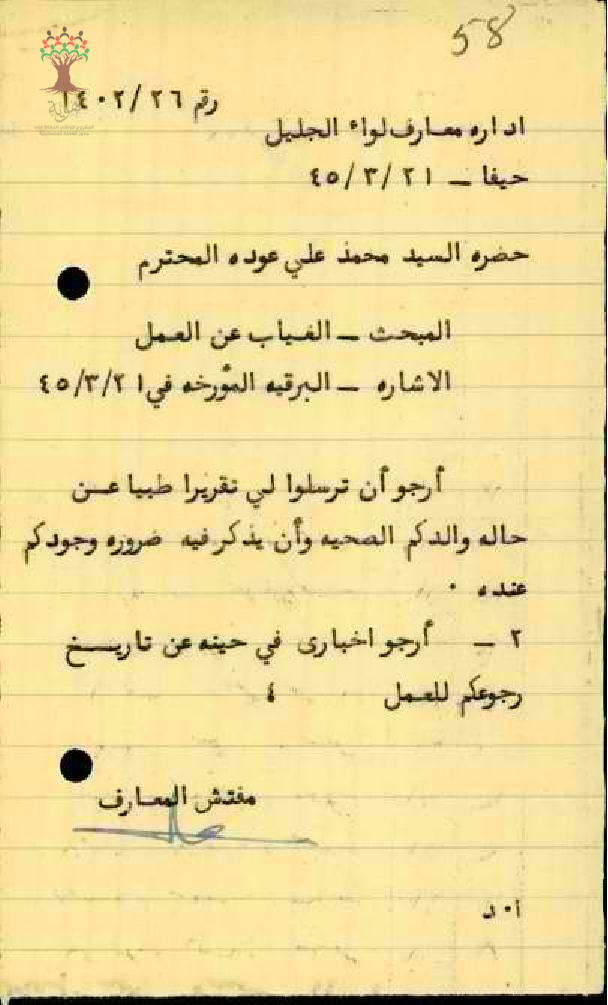 رسالة من مفتش المعارف الى المعلم محمد علي عودة ارجو ان ترسلو لي تقرير طبي عن حال والدكم الصحي