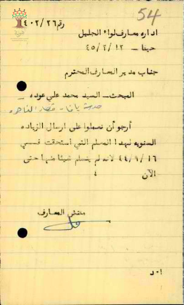رسالة من مفتش المعارف الى جانب مدير المعارف ارجو ان تعملو على ارسال الزيادة السنوية الى المعلم محمد علي عودة